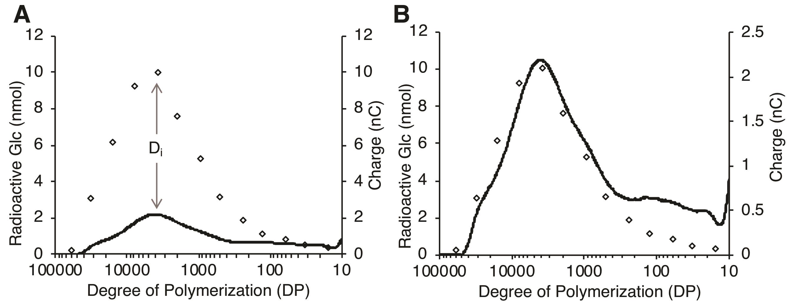 More recently, size exclusion chromatography (SEC) has been used to characterize the length of water-insoluble polysaccharides; however, the chromatography conditions and detection methods frequently limit its use in detailed mechanistic investigations. For example, fungal cell wall glucan and chitin were analyzed by SEC after carboxymethyl derivatization with monochloroacetic acid using radioactivity as the detection method (Cabib and Duran, 2005; Cabib, 2009). This chemical derivatization solubilizes otherwise water-insoluble glucan and chitin and allows SEC analysis using an aqueous solvent. However, since the derivatization is not quantitative, the absolute length of the polymers was not determined, and only the relative lengths of glucan- and chitin-containing isolated cell walls were determined (Cabib et al., 2012).