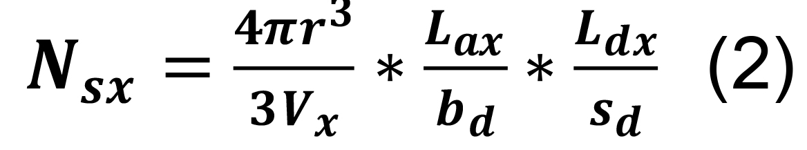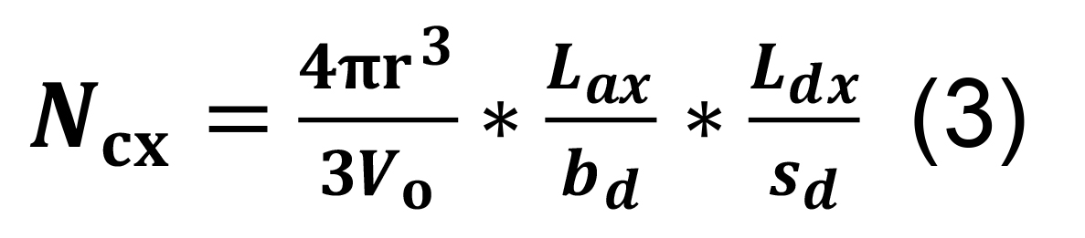 where the volumetric ratio between the sphere defined by the radius of interaction r and Vo represents the chance of an encounter for any given pair of axonal boutons and dendritic spines or shafts, and Lax/bd and Ldx/sd correspond, respectively, to the number of axonal boutons and dendritic spines or shafts in parcel x.