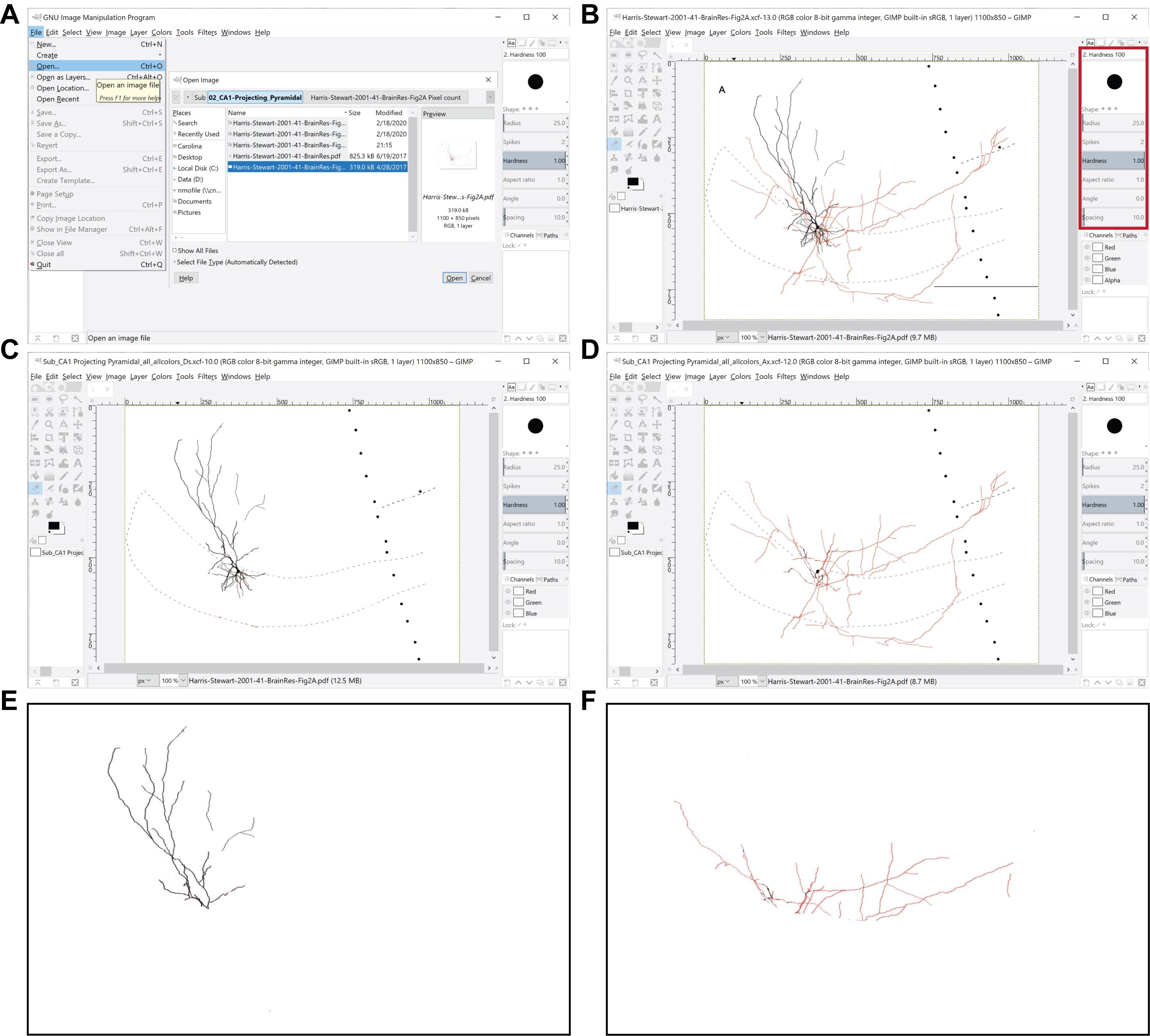 Figure 2. Preprocessing of images for the quantitation of axonal and dendritic lengths. A. The GIMP File menu is used to open an image file to be processed. B. Representative image is in preparation for processing (Harris et al., 2001), where the red box delimits the toolbox location and the circle represents the eraser tool. C, D. Shown are processed images containing only dendrites (C) or axons (D) in all the layers of the region of interest (in this example, the subiculum), which were obtained from the original image shown in (B). E, F. Shown are representative images displaying only dendrites (E) or axons (F) in the parcel of interest (in this case, the stratum moleculare of the subiculum), which were obtained from the original image shown in (B).