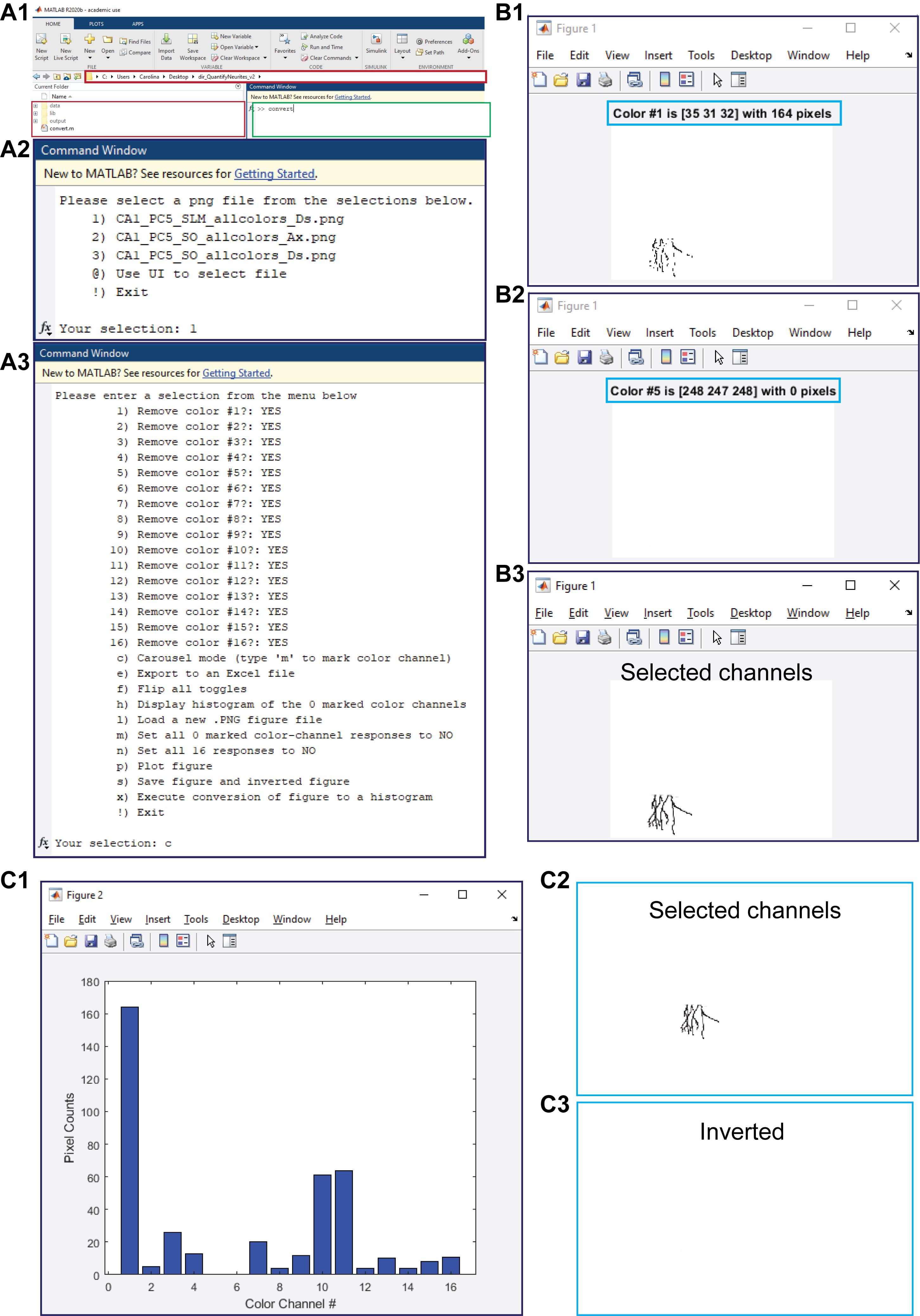 Figure 3. Pixel counting. A1. Shown is a MATLAB window with the open working folder “dir_QuantifyNeurites_v2” in a red box and the command window to run the command “convert” in a green box. A2. The displayed menu that appears after running the command “convert” to select the image to process. A3. The displayed menu options that appear in order to analyze the selected figure. B. Shown is a representative carousel mode, where the color number and the number of pixels present (B1) or absent (B2) are delimited within the blue boxes and where a final plot figure contains only the channels selected during the full run of the carousel mode. C. Presented are a histogram of the selected channels and the number of pixels per channel (C1) and the generated PNG files for the selected (C2) and unselected (C3) channels.