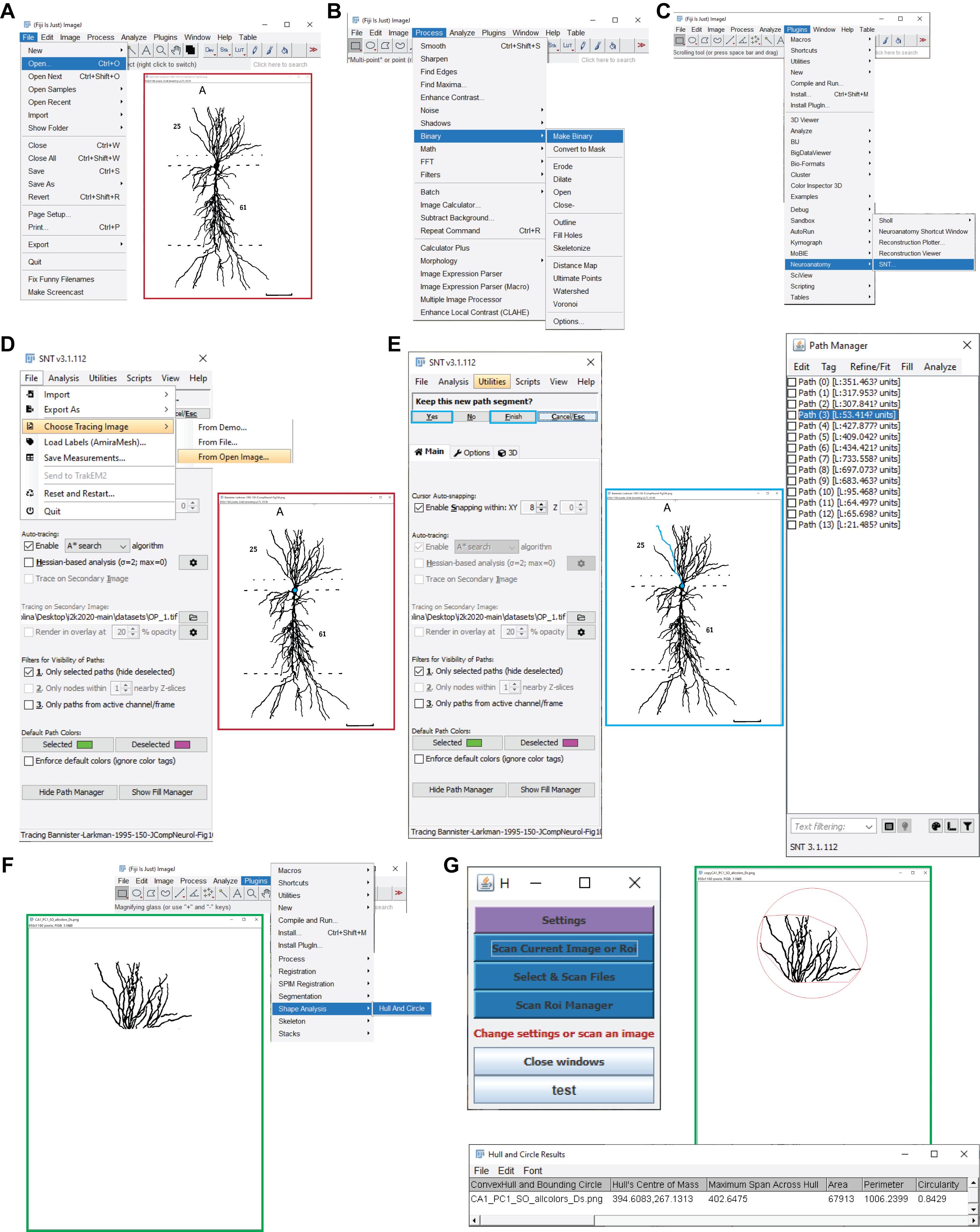 Figure 4. Determining the somatic distances and convex hull volumes. A. Shown are the Fiji menu steps to open an image for path tracing (e.g., a CA1 pyramidal neuron; Bannister and Larkman, 1995). B. Displayed are the menu steps to convert the image into a binary image. C. Presented are the menu steps to run the Simple Neurite Tracer plugin. D. Shown are the Simple Neurite Tracer steps to load the open image for tracing. E. Presented is a representative Simple Neurite Tracer console that shows one path in blue (middle), with the options to finish the path and continue tracing on the console (left), and the path manager, with all the traces that correspond to the different parcels of the original image (right). F. Shown are the menu steps to run the Hull And Circle plugin for the dendrites located in the parcel of interest (e.g., CA1 stratum oriens; green box) for the convex hull measurement. G. The Hull And Circle toolbox (left) is used to scan the current image, where the image with the delimited area is shown in green and the bottom panel shows the emerging results window.