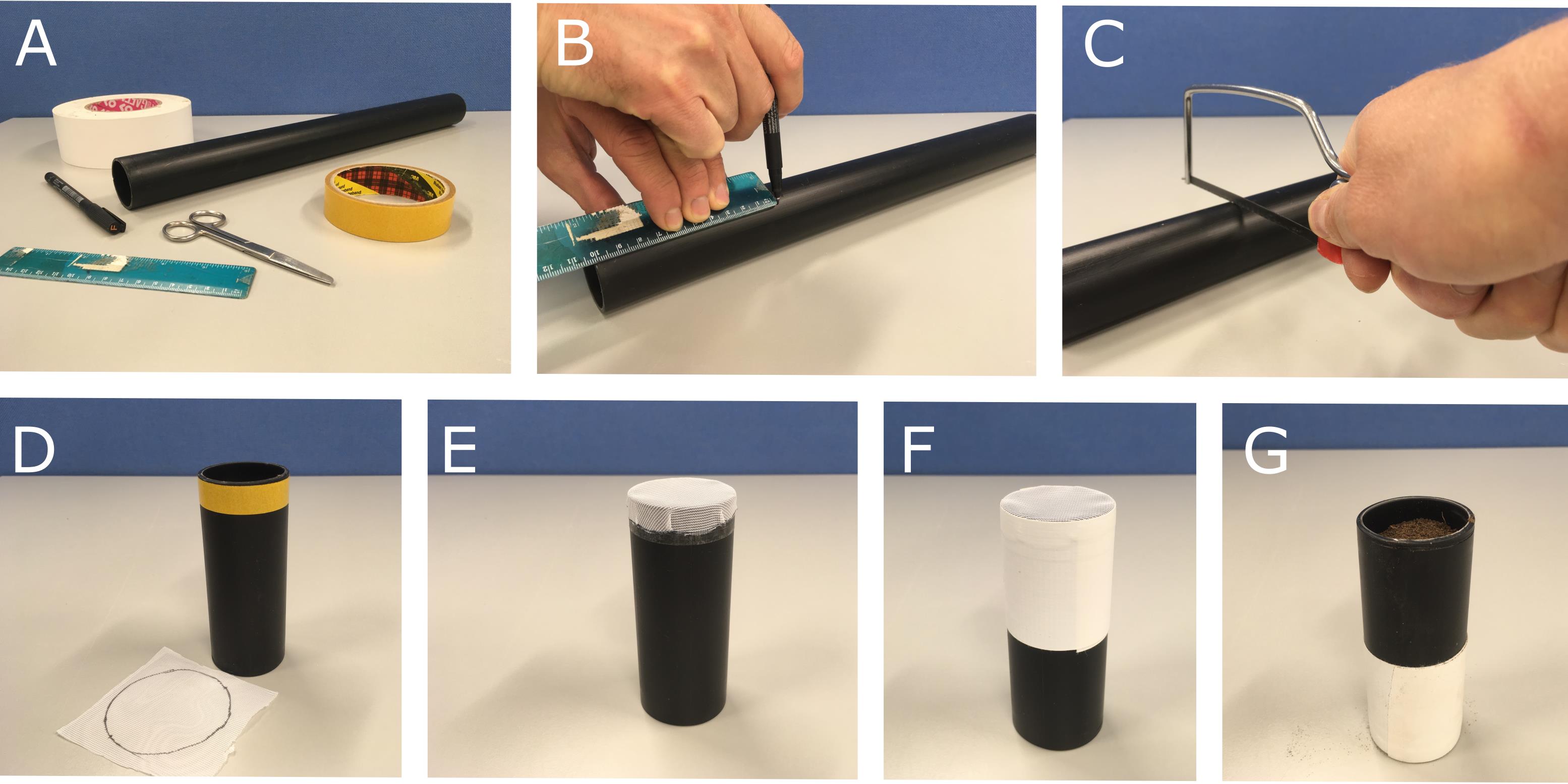 Figure 2. Example method to prepare columns for growing plants in soil for CT imaging. (A) Starting materials, (B) Marking 10 cm drain pipe length, (C) Cutting drain pipe with a hand saw (D) Double sided tape attached to column (upside down) and nylon mesh circle (5 cm diameter), (E) Nylon mesh fixed to column after removing double side tape backing, (F) Cloth backed adhesive tape added to securely attach mesh to column, (G) Finished column filled with soil (right way up).