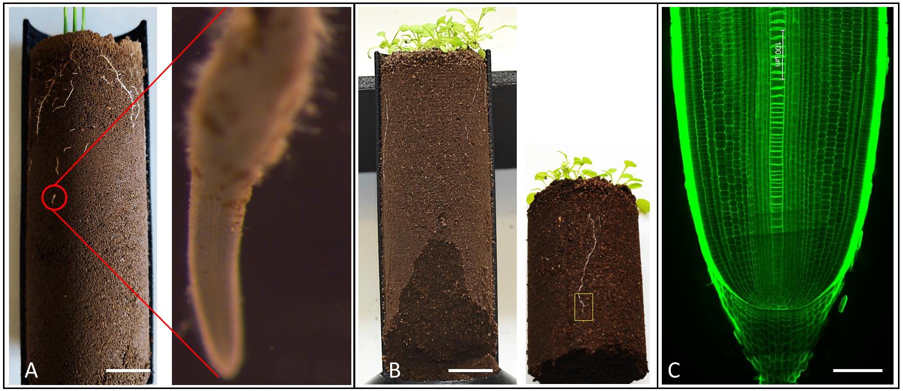 Figure 3. Identification and selection of roots for anatomical scale imaging. Rice (A) and Arabidopsis root (B) grown in 3D printed (half open) column growing in compacted soil. The red circle and yellow rectangle show the root tip zone of rice and Arabidopsis roots, respectively. (C) Longitudinal image of rice root tip grown in non-compacted soil.