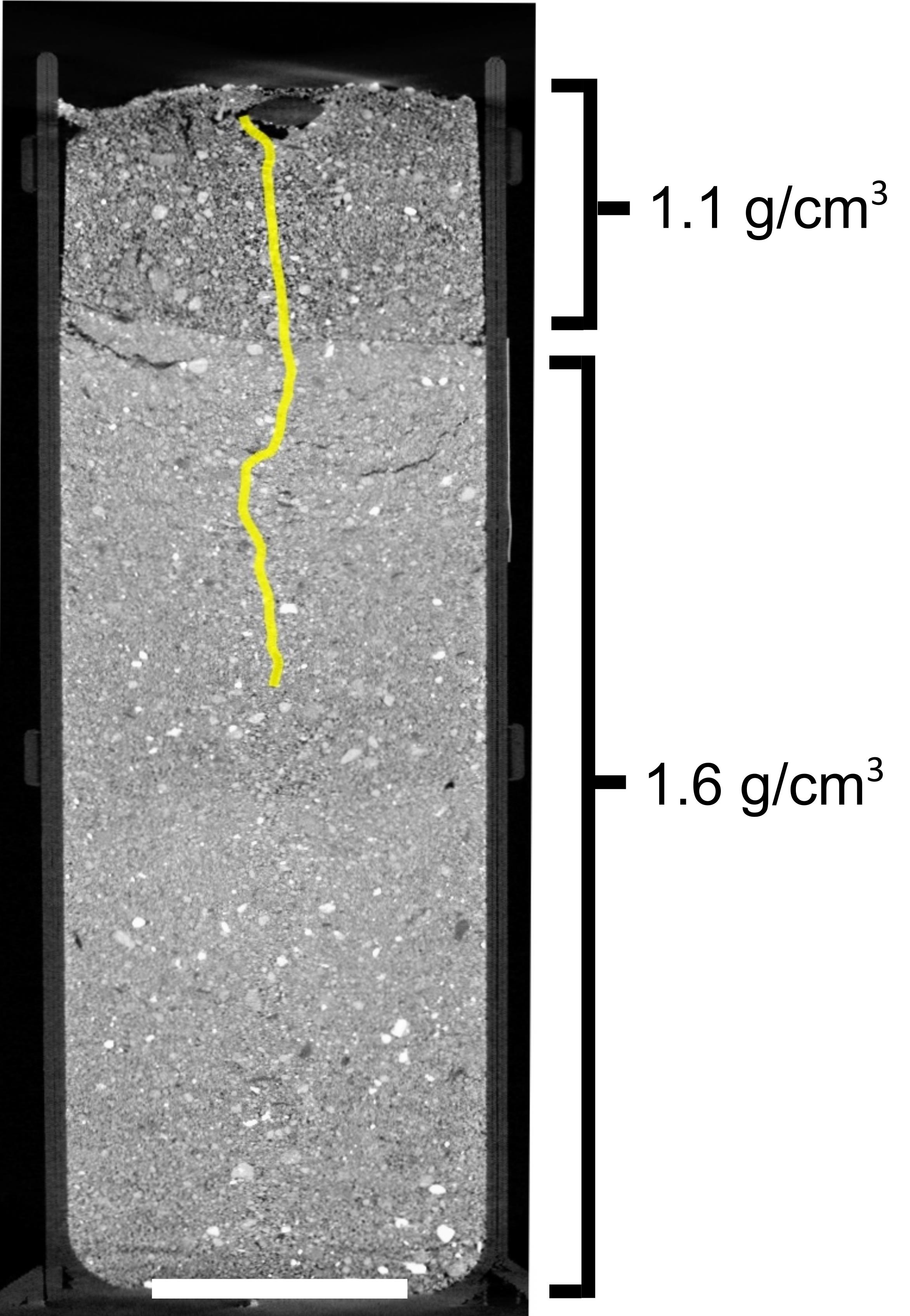 Figure 4. CT image showing rice root growth in compacted soil with BD of 1.6 g/cm3. The upper 1 cm is non-compacted soil (1.1 g/cm3) to allow the initial establishment of the root; the root then grows into the compacted (1.6 g/cm3) soil in the lower part of the column. Scale bar 20 mm.