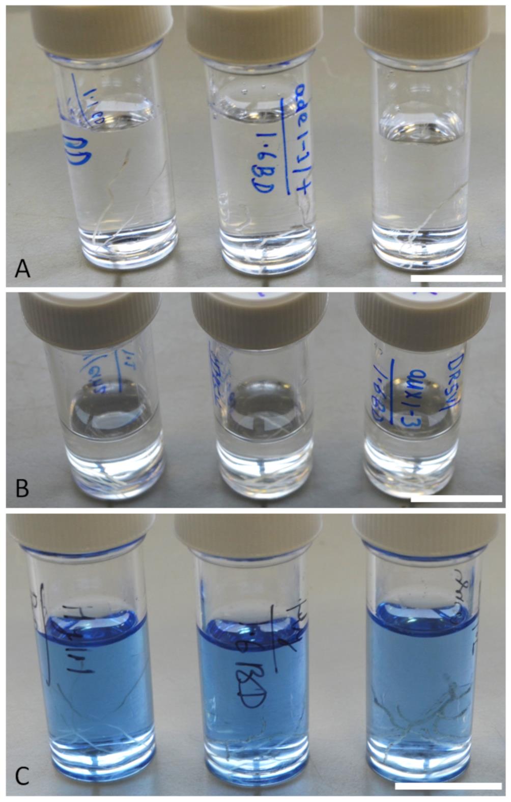 Figure 5. Schematic images showing rice root tip fixation in 4% PFA (A), clearing in ClearSee solution (B) and staining with calcofluor dye (C). Scale bar 15 mm.