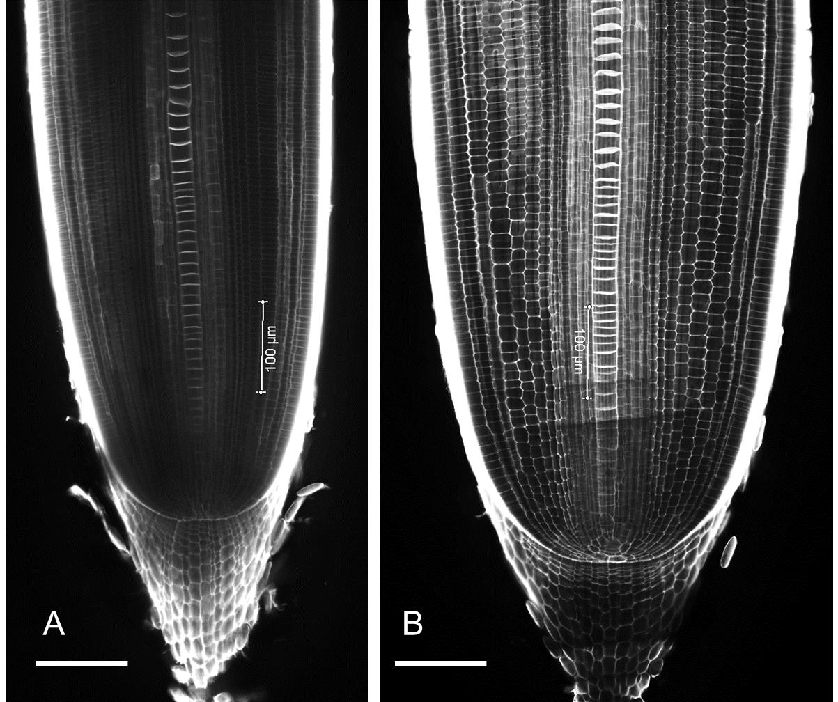 Figure 6. Example longitudinal images of rice root tips grown under (A) non-compacted (1.1g/cm3) and (B) compacted (1.6g/cm3) soil conditions for 10 days. Rice roots in compacted soil have a larger root diameter. Scale Bar 100 µm.
