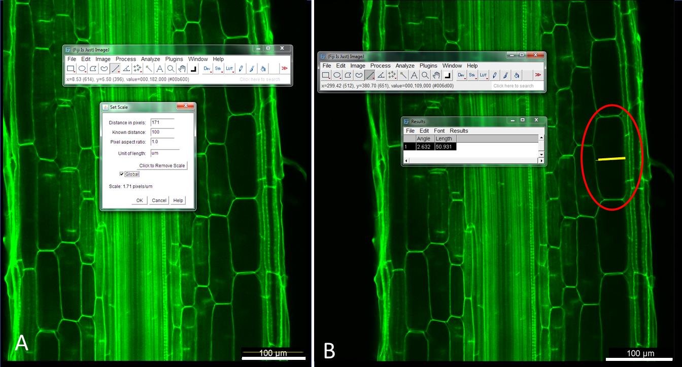 Figure 8. Illustration of how to (A) set the image scale and (B) quantifiy root cortical cell diameter using Fiji software. (A) Use the ‘line tool’ to measure the scale bar and then ‘set scale’ to 100 microns. (B) Use the line tool to measure the cortical cell diameter (red circle).