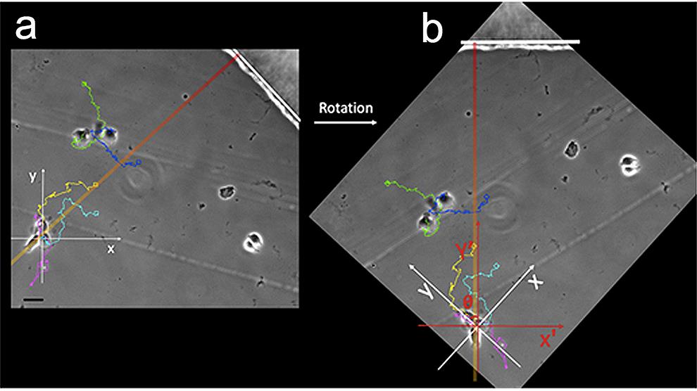 Remember, since the Dunn chamber has an annular form, in most of the observed fields the y-axis of tracked cells are not aligned with the HRGβ1 gradient axis. Thus, you have previously performed image stacks rotations, so that y-axes become parallel to the gradient axis. Each field has a rotation angle (θ) you have saved during the analysis step on Metamorph®.