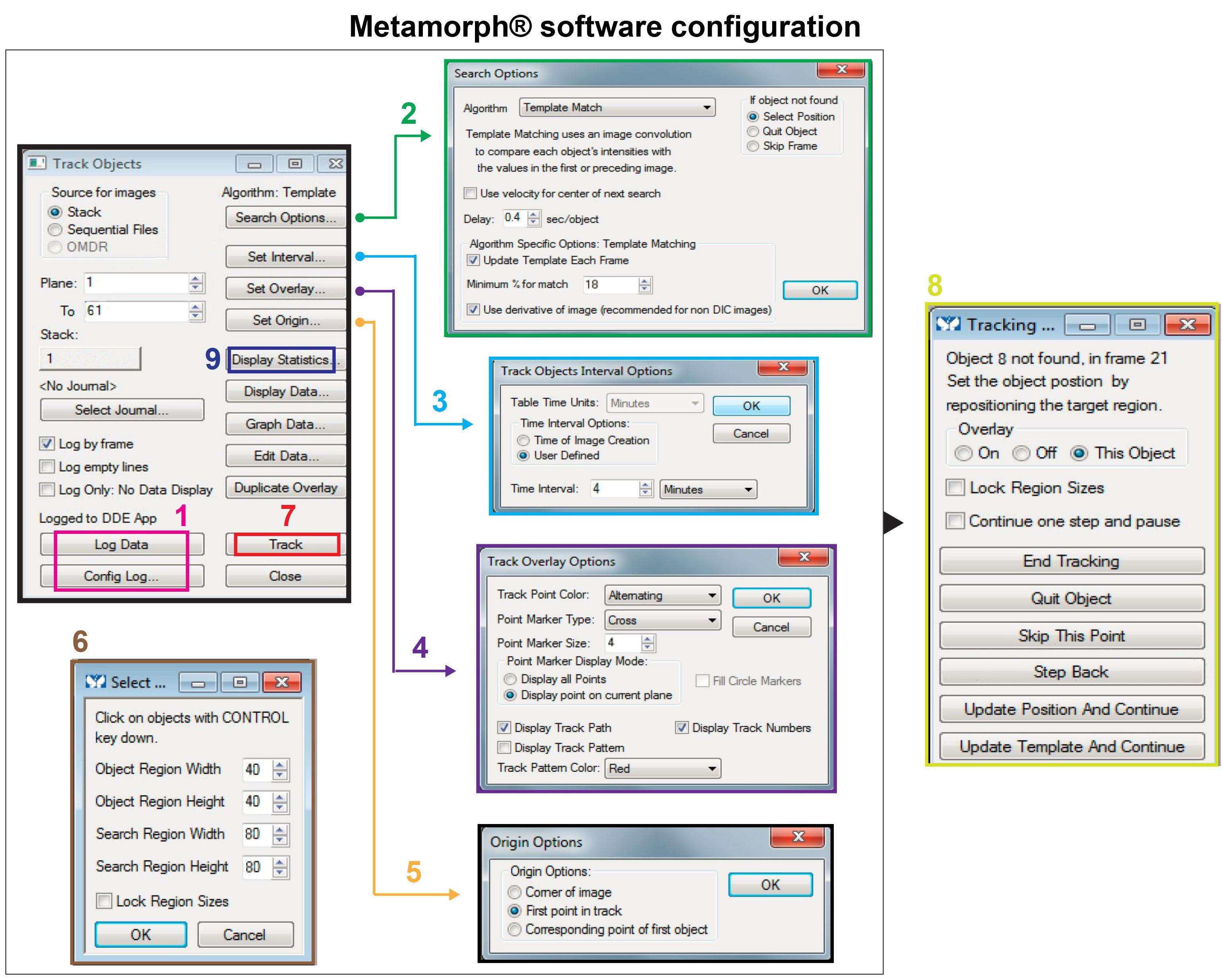 Figure 2. A plan summing up the essential settings required for cell tacking on Metamorph® software. The detailed settings of the menu options numbered from 1 to 9 are listed in the above text.