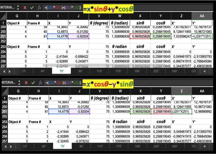 Figure 3. An example of data analysis and x, y coordinate rotation using the mathematic formula on Excel. Cell tracking information of the same image stack is gathered in one spreadsheet. Here, we assembled all spreadsheets of a single experiment in one Excel file. In this example of a spreadsheet, column G contains object (cell) number, column H contains frame number, and columns I and J contain (x, y) coordinates of each frame. All additional information, about the rotation angle θ and the (x’, y’) new coordinates, are added manually on the Excel spreadsheet. In this example, the rotation angle is 75°, it is added in column V. Columns W, X, and Y contain calculations that we use for the rotation formula, to readjust coordinates (x, y) to (x’, y’). The formula for y’ coordinates are in column Z, highlighted in the upper screenshot. The formula for x’ coordinates are in column AA, highlighted in the lower screenshot.