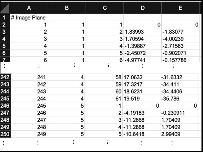The file must be organized in this order: Image plane, Object, frame, x' coordinate, y' coordinate.