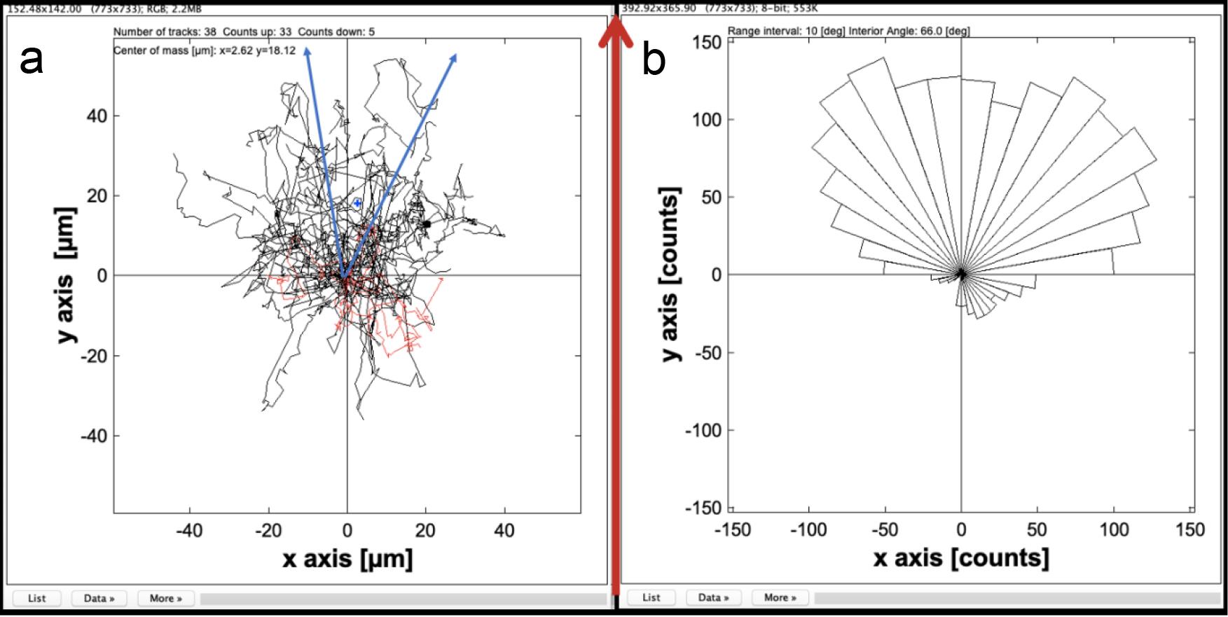 Figure 5. Examples of plots that represent chemotaxis migration. The red arrow indicates the HRGβ1 gradient axis. (a). A vector plot showing individual cell trajectories. Cells whose final positions are in the lower part of the graph are in red, and cells in the upper part of the graph are in black. Centre of mass (blue point) and confidence interval (blue arrows) are drawn to statistically represent chemotaxis migration in the plot. (b). A rose plot (also called circular histogram) shows the chemotactic tendency of whole cells. Each segment (10°) area represents a count of cells whose positions fit in the chosen angle (interior angle 66°).