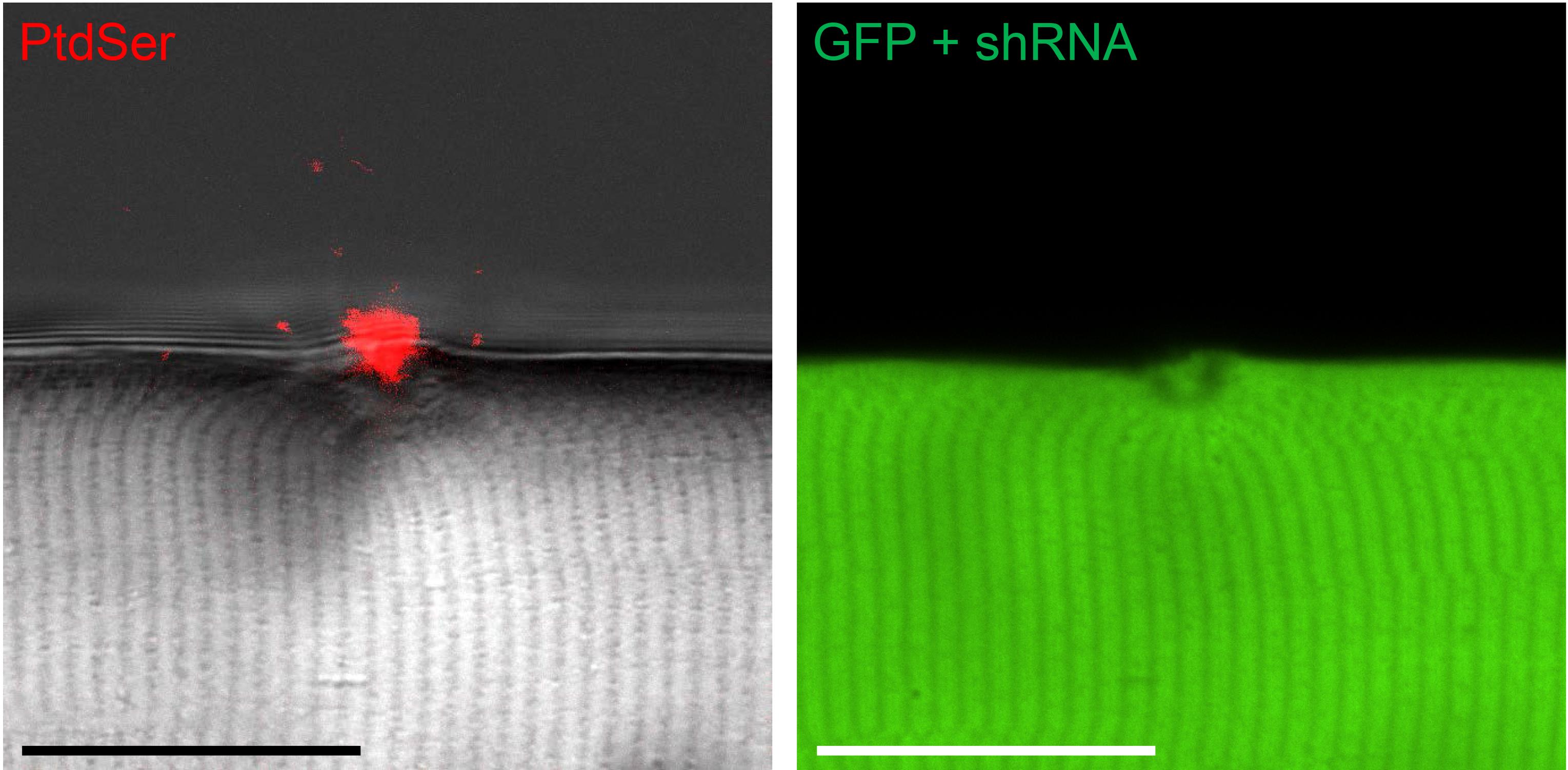 Muscle fibers can be electroporated with plasmids to modulate gene expression (e.g., short-hairpin or micro-RNAs) and a reporter gene (in this case, green fluorescent protein), and then analyzed for phenotype seven days later. In this example, a small molecule sensor for phosphatidylserine (fusion protein of lactadherin C2-domain and mCherry fluorescent protein) was included in imaging medium, the muscle fiber membrane was damaged by 405 nm light, and accumulation of the sensor was observed at the damage site with timelapse confocal microscopy. Images are shown from approximately 7 min post-laser injury. In this example, the shRNA did not influence the localization of the phosphatidylserine probe after injury (Figure 1). Note that the ability of a given plasmid to modulate gene expression should be validated in vitro before in vivo use.