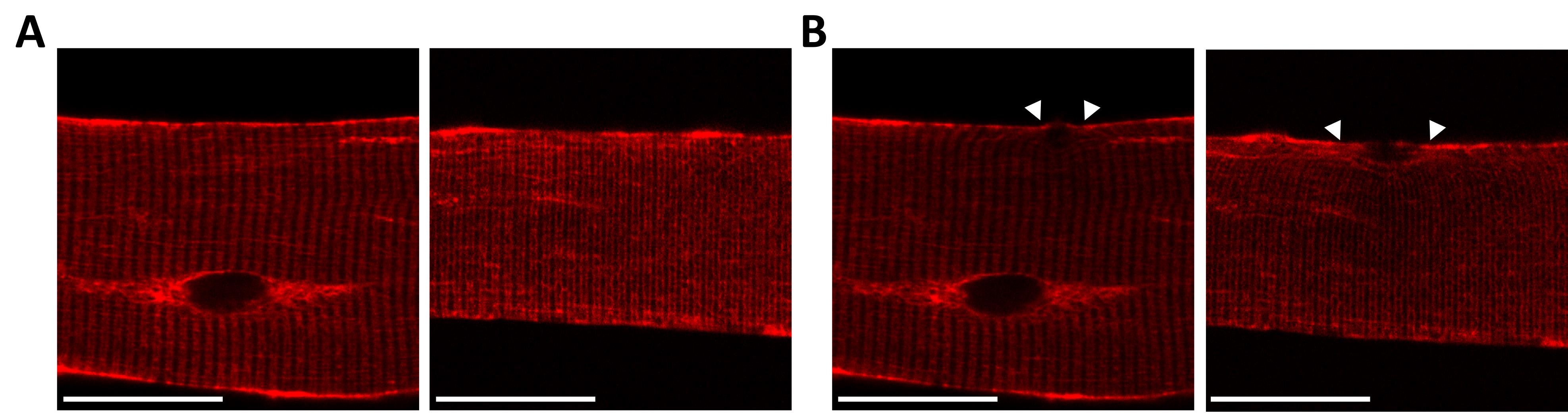 Amphyphysin-2 (BIN1) is a membrane-remodeling protein with a putative role in transverse-tubule biogenesis. Expression of BIN1-mCherry shows expression apparently in t-tubules (Figure 2A), which is in agreement with subcellular localization reported (Prokic et al., 2020). Seven minutes after damage to the sarcolemma, BIN1 becomes enriched at the plasma membrane near the site of injury (white arrowheads, Figure 2B).