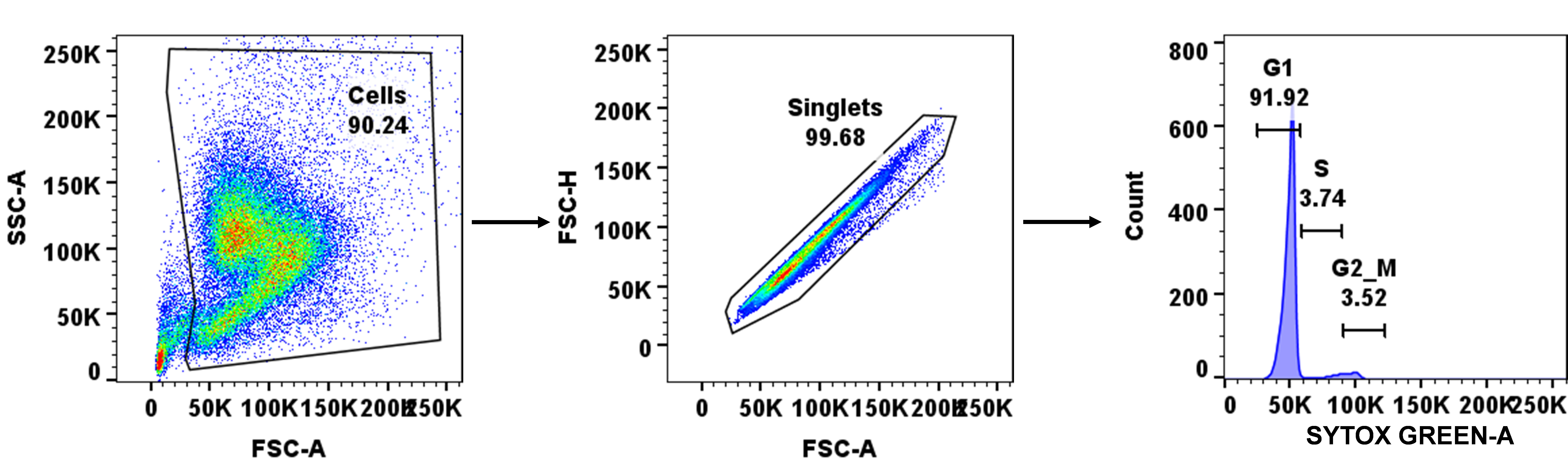 Follow a similar gating strategy as that of the FACSDiva software during acquisition. First, discriminate the debris from the cells by plotting SSC-A vs. FSC-A; then, from the cells, gate the singlet population by plotting FSC-H vs. FSC-A; finally, take singlet cells for cell cycle analysis via histogram plot of SYTOX green-A vs. Count (Figure 4).
