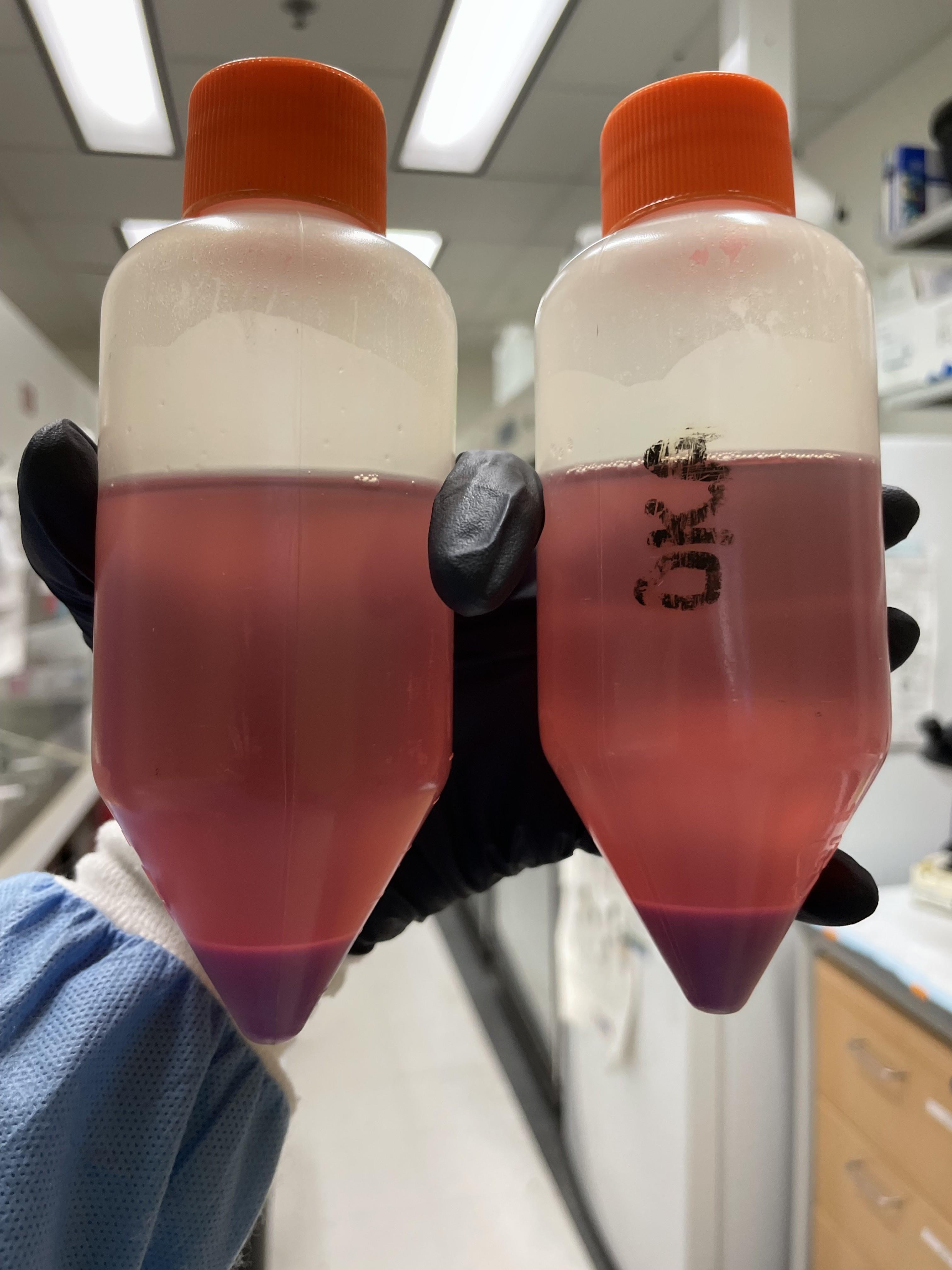 Formation of a ring of cells inside the baffled Erlenmeyer flask | Transfer cells/media to new baffled Erlenmeyer flask. However, this ring has not shown to be detrimental in production quality, so you may choose to continue culturing those cells if you desire. |