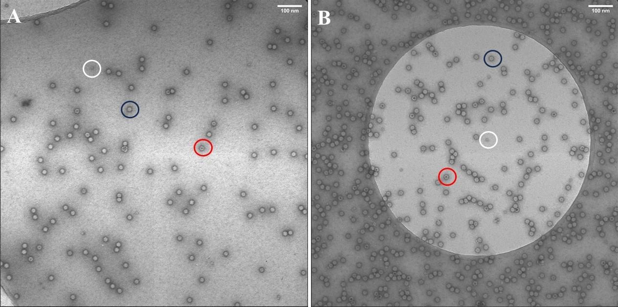 Figure 9. Negative stain transmission electron microscopy images. A. AAV9-EF1-N-cG produced by suspension 1F11S cells. B. AAV9-EF1-N-cG produced by adherent 1F11 cells. The black circle indicates a full capsid having no darkly stained center. The red circle indicates an empty particle showing a dark stain in the particle center. The white circle indicates impurities previously identified as ferritin (Grieger et al., 2016). Scale bar: 100 nm.