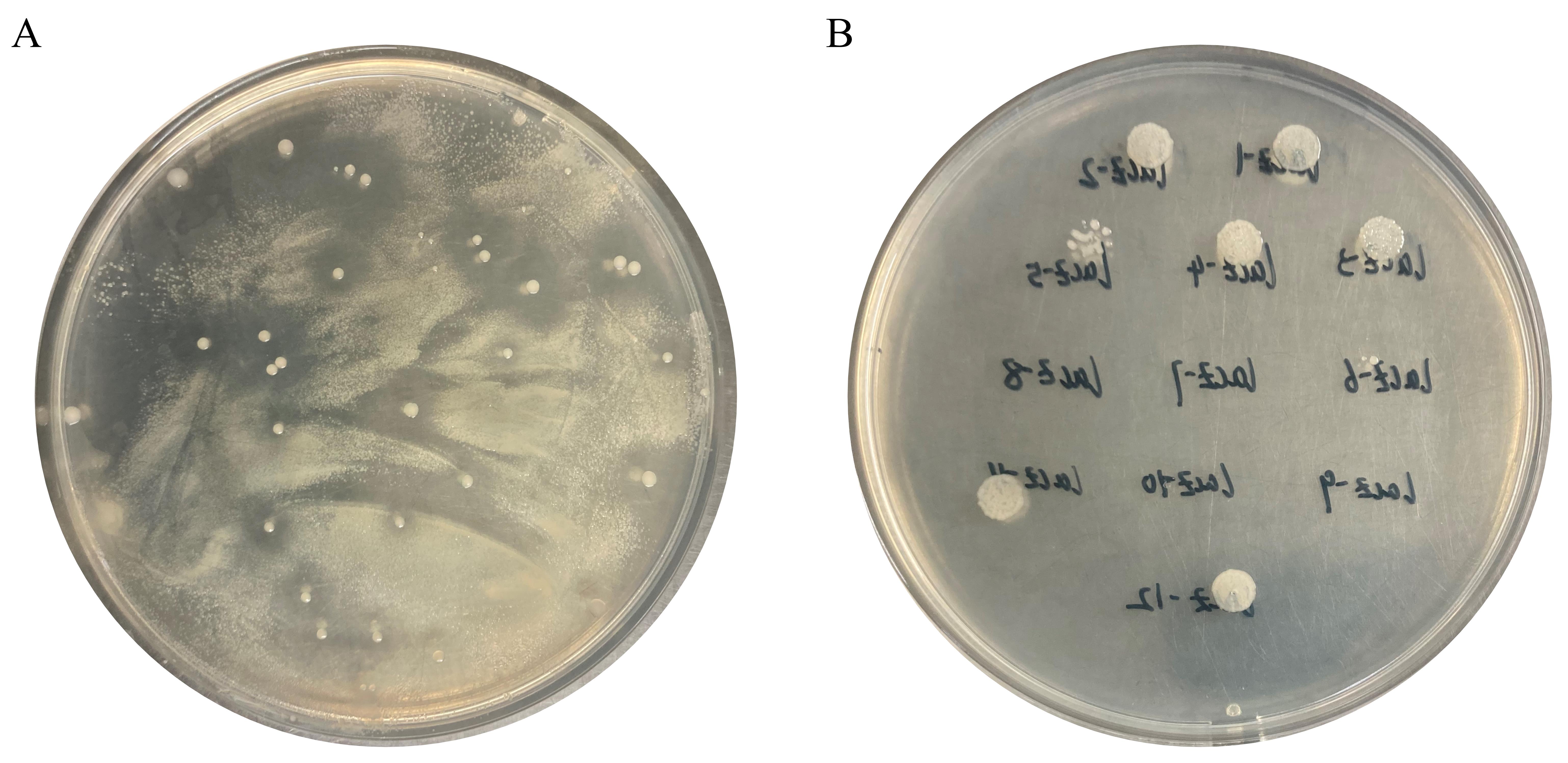 Aspirate 2.5 µL of the culture with a band size of 1,887 bp and dispense it onto LB agar medium (K+) at 28 °C for 24 h. A knockout strain (ΔlacZ) is obtained that was not grown on K+ LB agar medium (Figure 5B). See General note 6.