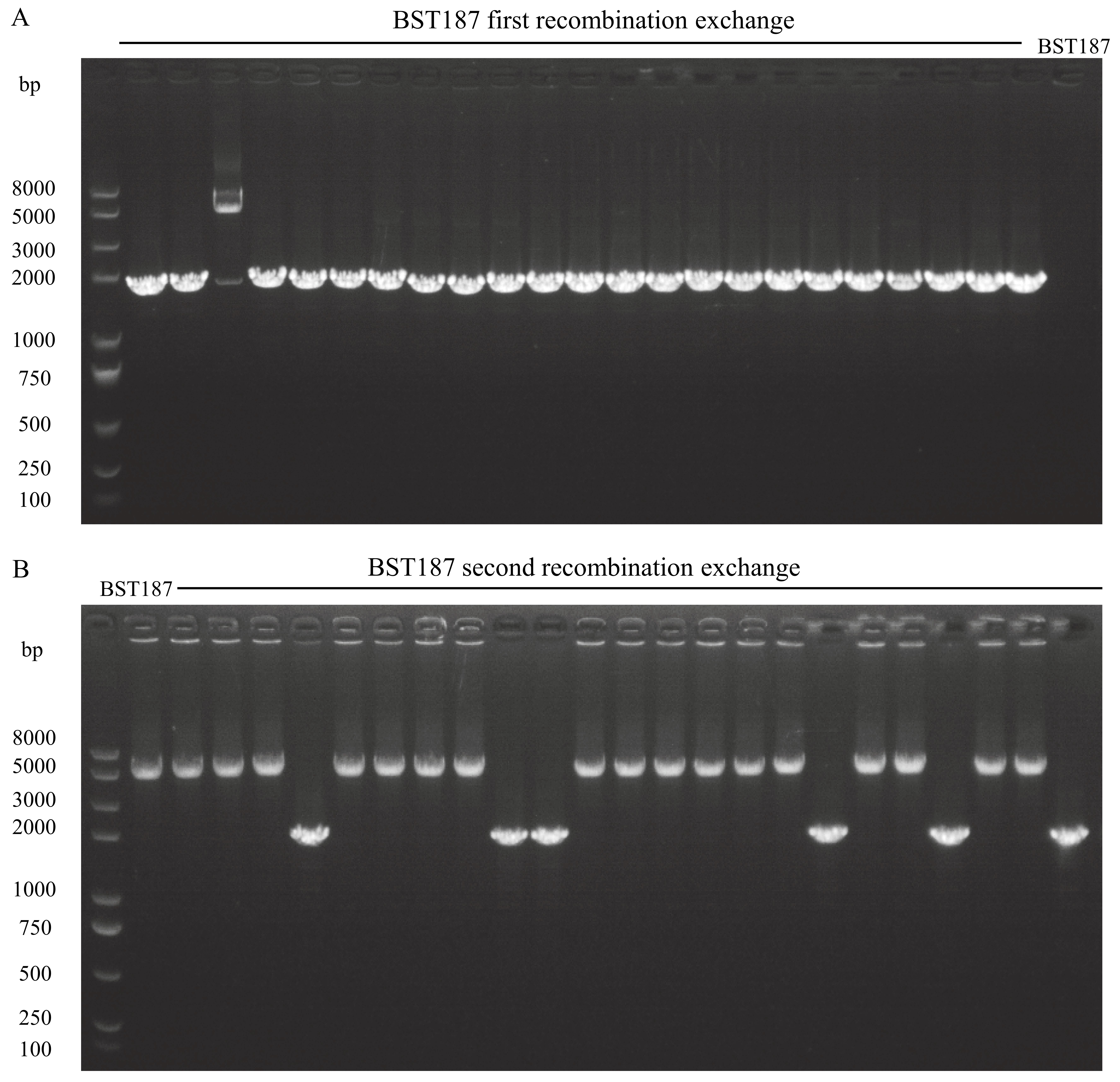 Figure 6. PCR amplification from BST187 that completed recombination exchange. A. First recombination exchange. B. Second recombination exchange.