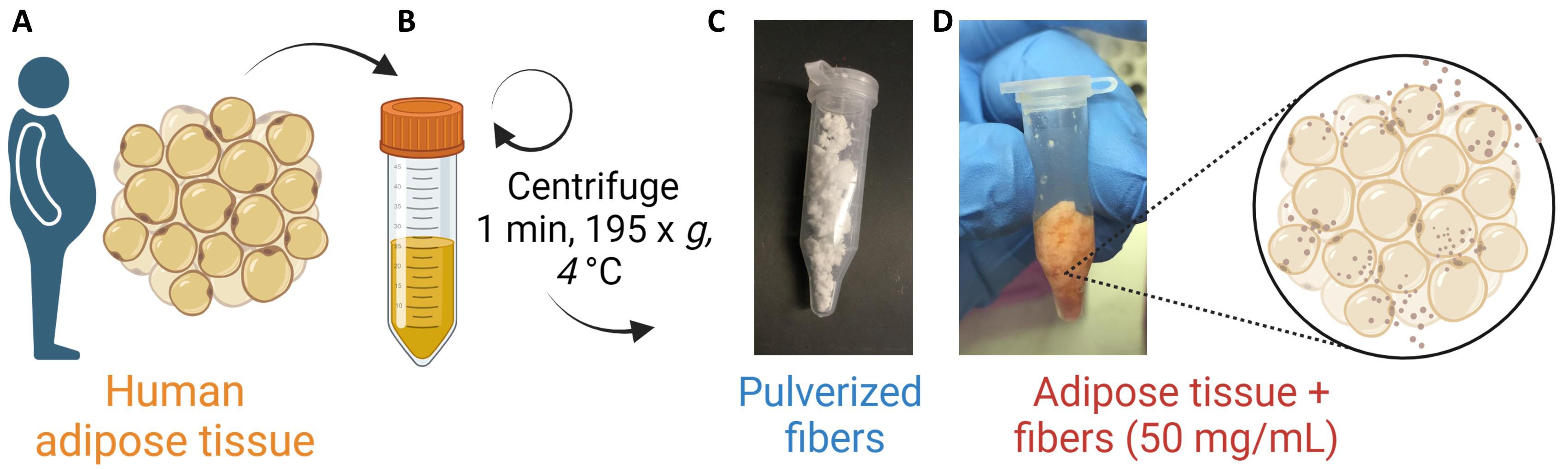 Figure 2. Co-injectable nanofiber and adipose tissue. A. Adipose tissue collected from patients using standard liposuction procedures. B. The tissue is centrifuged to separate fat oils and anesthesia from viable cells. C. Pulverized fibers (50 mg) are combined with (D) adipose tissue (1 mL) to form an injectable solution (50 mg/mL).