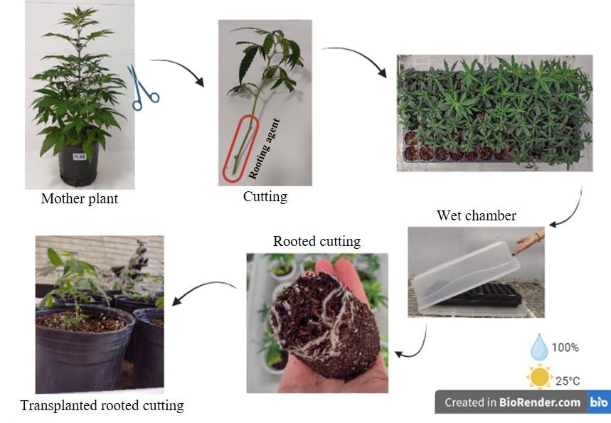 Figure 1. Vegetative propagation of cannabis by stem cuttings procedure. The diagram illustrates the process of taking a cutting from a mother plant in the vegetative stage, highlighting the area where the rooting hormone is applied. The cuttings are then placed in a tray with substrate within a wet chamber, where they remain until visible roots form.