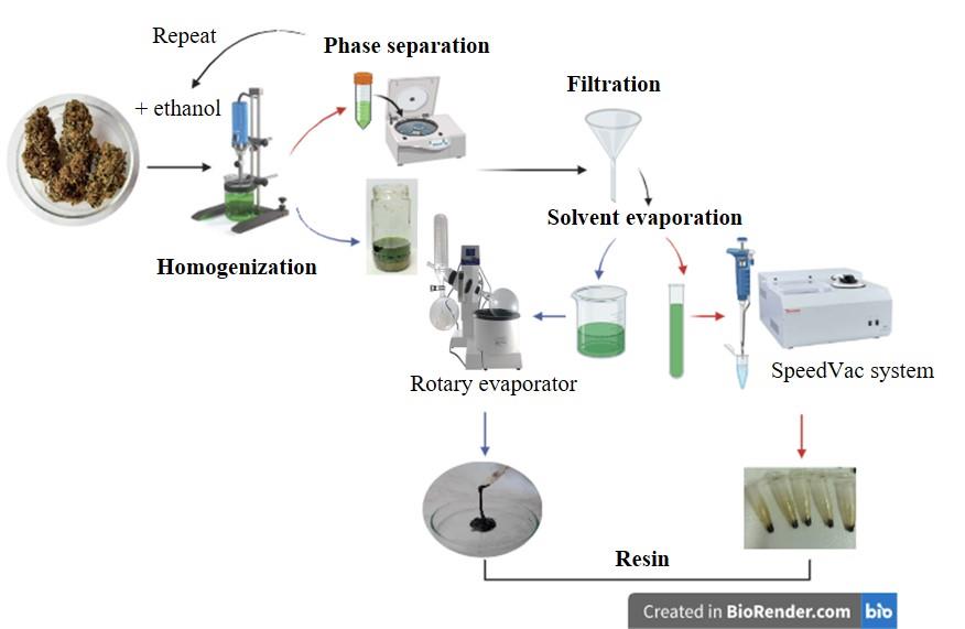 Figure 2. Procedure for resin extraction from female inflorescences. The procedure for working with small volumes (red arrows) involves the use of a centrifuge and SpeedVac equipment. For larger extraction volumes (blue arrows), the extract is decanted prior to filtration, and the solvent is removed using a rotary evaporator.