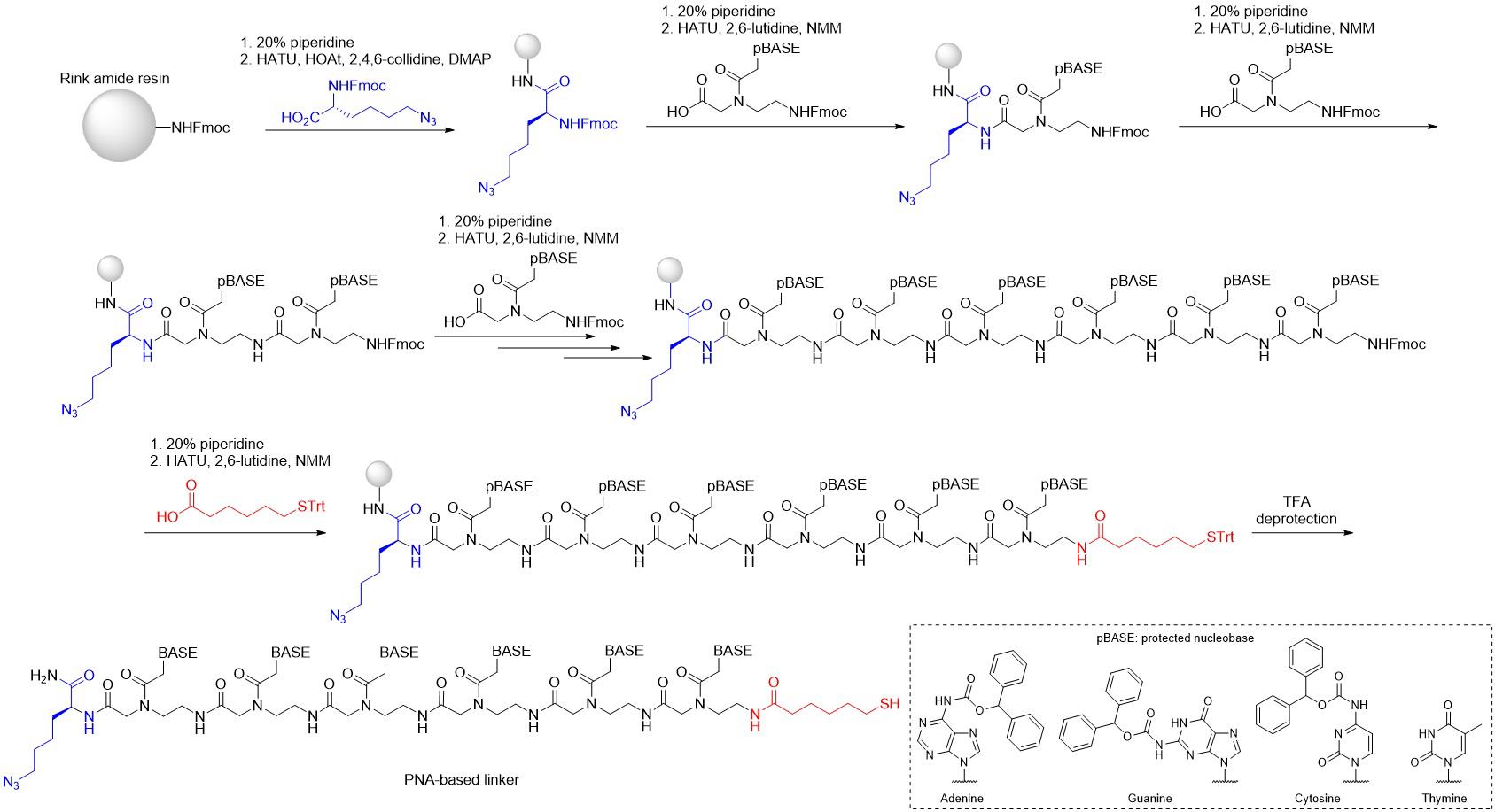 9. PNA monomers: Fmoc-A(Bhoc)-OH (PNA Bio, catalog number: FMA-1001), Fmoc-C(Bhoc)-OH (PNA Bio, catalog number: FMC-1001), Fmoc-G(Bhoc)-OH (PNA Bio, catalog number: FMG-1001), and Fmoc-T-OH (PNA Bio, catalog number: FMT-1001)
