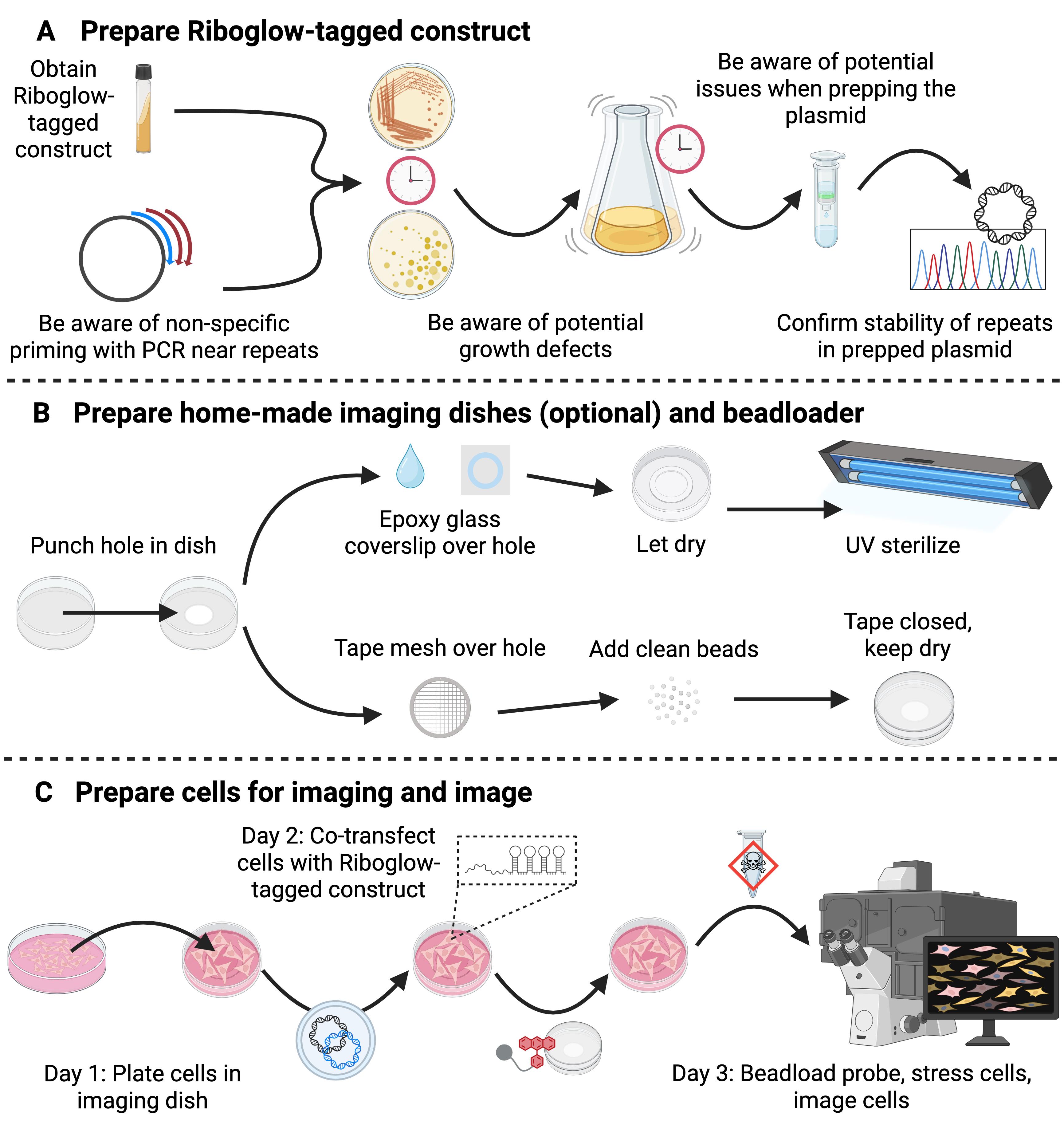 Solution: In this protocol, we use U-2 OS cells, and our concentrations and incubation time for the stressors have been validated in this cell line. If you use a different cell line or express an RNA of interest that may impact the cells’ ability to handle stress, you may need to modulate the concentration of the stressor or its incubation time on the cells.