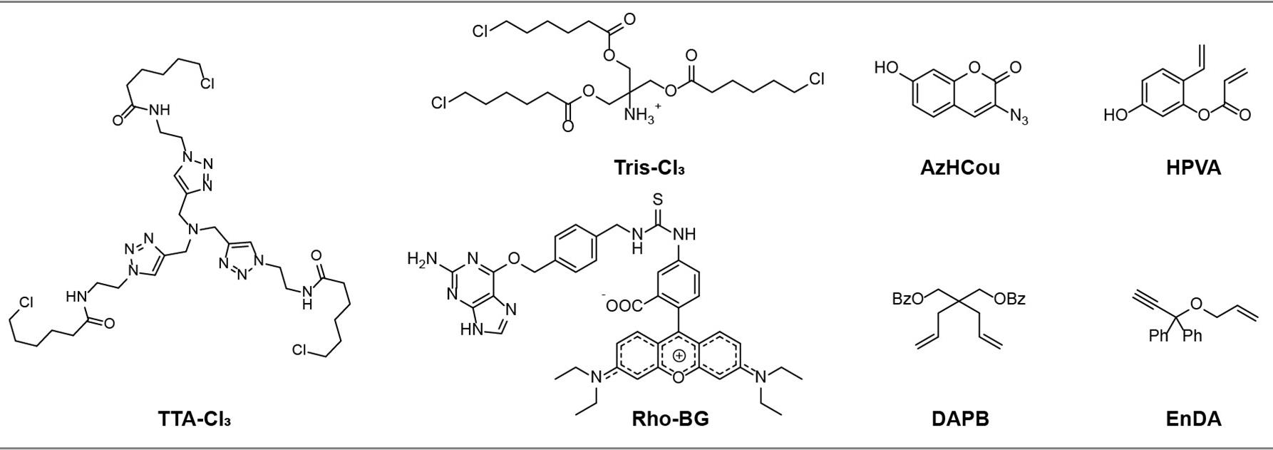 Note: The structures of TTA-Cl3, Tris-Cl3, Rho-BG, HVPA, DAPB, EnDA, and AzHCou are shown in Figure 2.