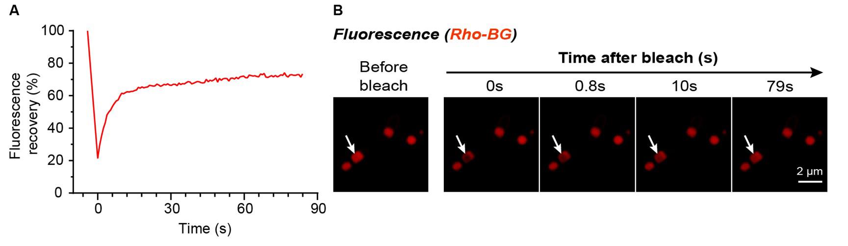 6. Perform confocal FRAP experiments using a Carl Zeiss LSM980 confocal microscope equipped with a 63× oil immersion objective. For intracellular FRAP, select a circular region of interest (ROI) with a diameter of approximately 0.3 μm within one half of an LLPS protein condensate (about 0.5 μm from the condensate edge). In our work, the Rho-BG-labeled HS protein was excited using a 561 nm laser. Image acquisition for the pre-bleach and post-bleach phases was conducted at a low laser intensity of 1.8%. The imaging sequence was initiated by capturing two pre-bleach images. Then, the ROI was bleached with high-intensity (100%) laser pulses until the fluorescence signal decreased to 20% of its initial intensity. Following bleaching, fluorescence recovery was monitored by acquiring a series of 112 post-bleach images. In total, 114 images were captured with a time interval of 0.78 s between frames. The microscope’s time-lapse acquisition software (time measurement) was used to track fluorescence recovery within the ROI. A detailed description of the fluorescence recovery analysis can be found in Data analysis A.
