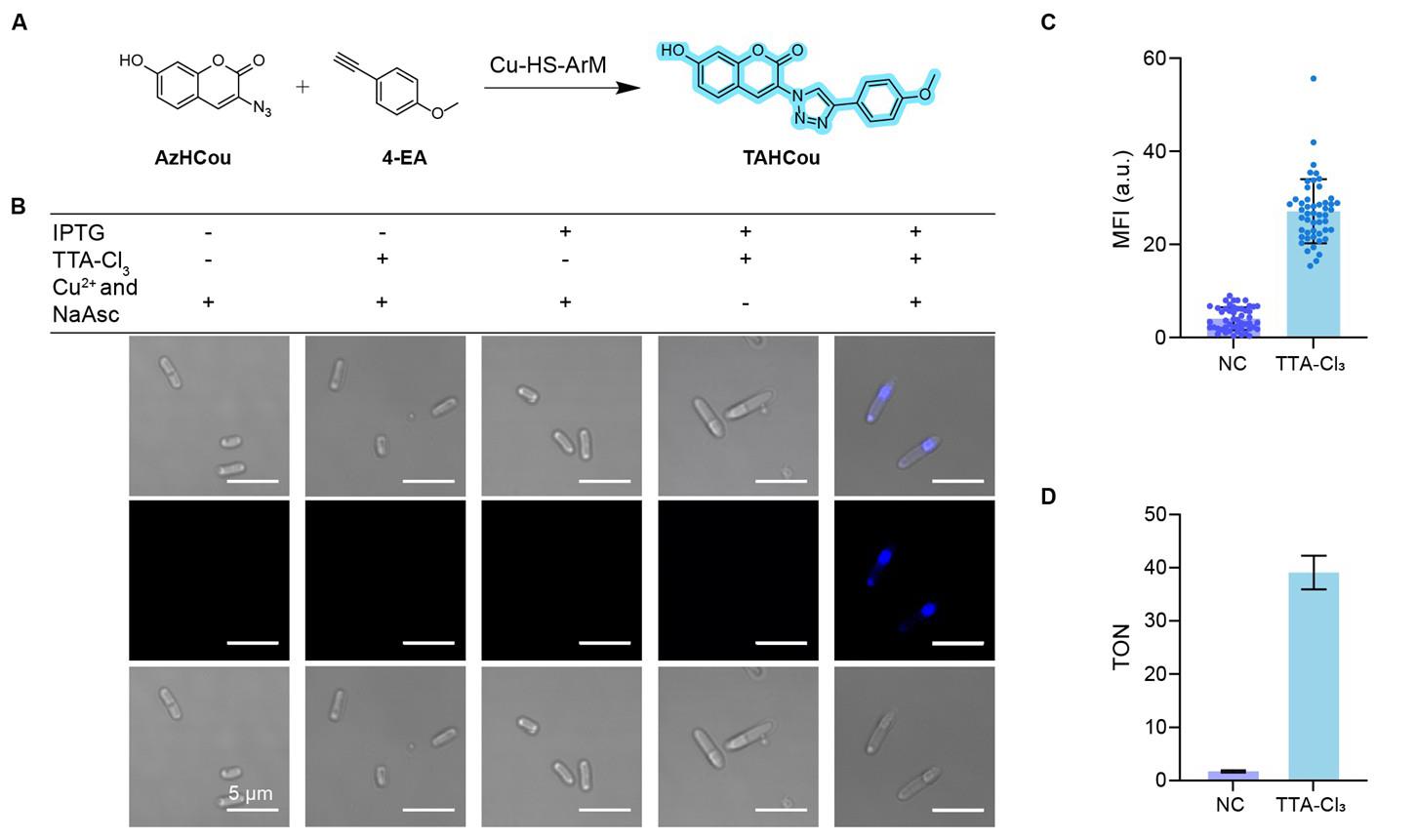In this study, we employed the widely used copper-catalyzed azide-alkyne cycloaddition (CuAAC) reaction between AzHCou and 4-EA (Figure 6A) as a model to directly observe the intracellular catalysis by Cu-ArM assembled within artificial compartments via confocal microscopy. The results demonstrated that IPTG effectively induces the expression of the HS protein, while TTA-Cl3 triggers LLPS of HS protein inside the cells, leading to the formation of stable artificial compartments. Within these compartments, HS protein acts as a ligand coordinating Cu2+ ions, and in the presence of NaAsc, Cu(II) is reduced to the catalytically active Cu(I) species. It should be noted that Cu2+ and NaAsc were introduced as a pair to give Cu(I); therefore, there are three variables: IPTG, TTA-Cl3, and Cu2+-plus-NaAsc. The CuAAC reaction proceeds efficiently only when all three conditions—HS protein expression, LLPS formation, and the presence of Cu(I)—are simultaneously met, with catalytic activity predominantly confined to the Cu-ArM-loaded artificial compartments (Figure 6B). Quantitative analysis of fluorescence intensity and TON (Figure 6C, D) further confirms the high catalytic efficiency of this system.
