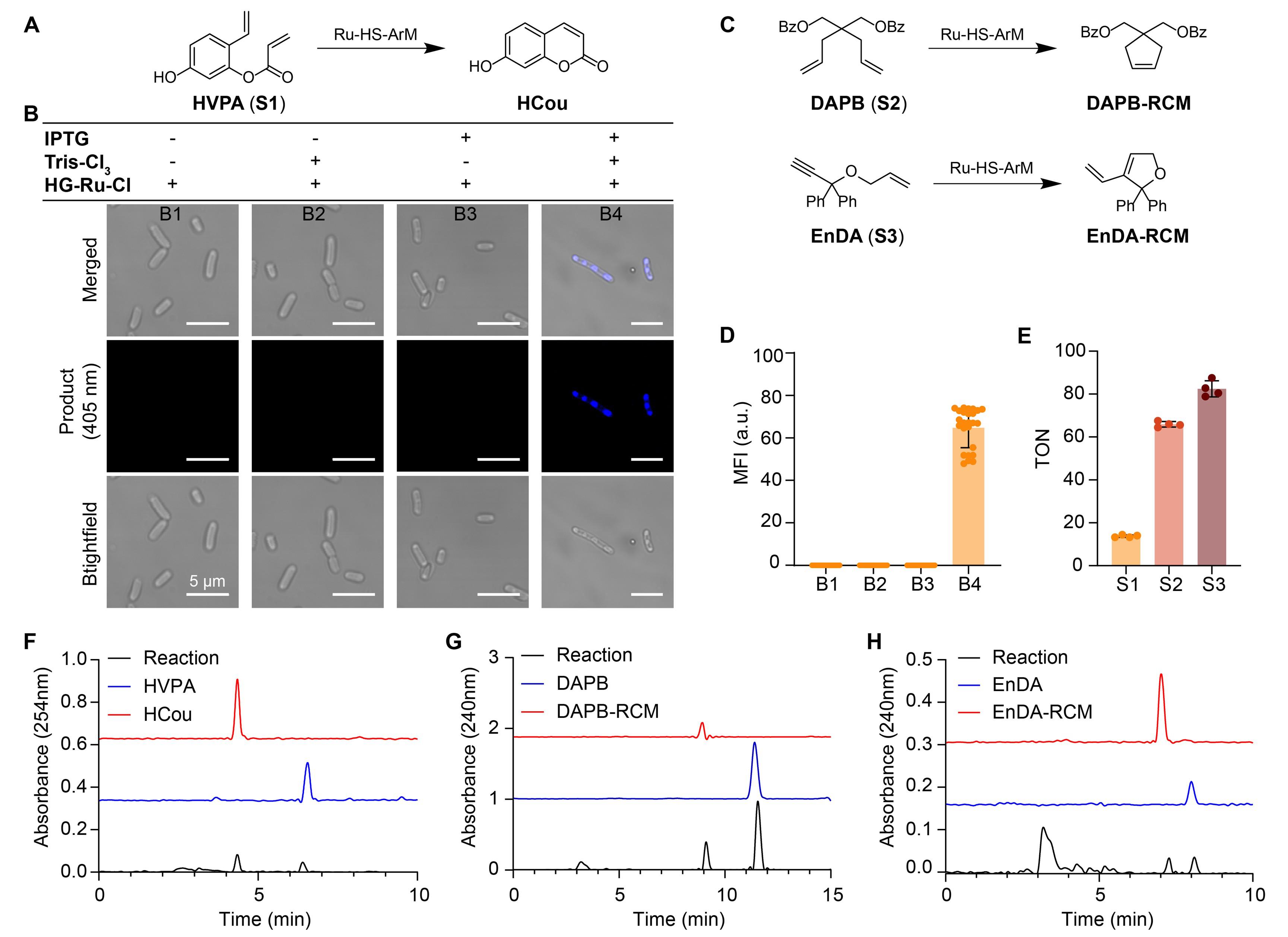 In this study, we employed HVPA as a model substrate for the ruthenium-catalyzed ring-closing metathesis (RCM) reaction, utilizing its intrinsic olefin groups (Figure 7A, C). The catalytic process was directly visualized via confocal fluorescence microscopy. The results demonstrated that IPTG induced the expression of HS protein, while Tris-Cl3 triggered the formation of LLPS of the expressed protein within E. coli, thereby forming intracellular artificial compartments. Simultaneously, the ruthenium cofactor (HG-Ru-Cl) was effectively incorporated into the ArM scaffold, generating catalytically active Ru-ArM. The RCM reaction proceeded efficiently only when all three conditions—HS protein expression, LLPS compartmentalization, and Ru cofactor installation—were simultaneously met, indicating that catalysis was mediated by the Ru-ArMs and was confined to the engineered compartments (Figure 7B). Furthermore, three different substrates (HVPA, DAPB, and EnDA) were tested, and product formation was quantified by HPLC (Figure 7F–H), along with TON calculations to evaluate catalytic performance (Figure 7D, E). These results confirm the feasibility and efficiency of performing Ru-catalyzed abiotic transformations within LLPS-based artificial compartments in living cells.