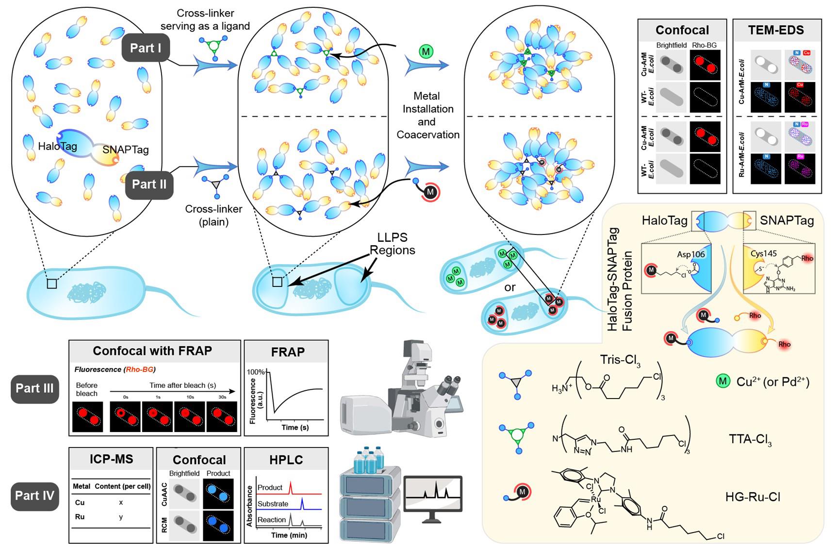 A cartoon illustration of the artificial metalloenzymes in artificial sanctuaries through liquid–liquid phase separation (ArMAS–LLPS) strategy using HaloTag-SNAPTag (HS) fusion protein as the artificial metalloenzyme (ArM) scaffold. In part I, a ligand-crosslinker was used to initiate the LLPS, followed by metal ion cofactor binding on the ligand to form ArMs inside the LLPS regions. In part II, a crosslinker without metal-coordinating function was used to initiate the LLPS, followed by metal complex cofactor anchoring on the HaloTag side of the HS scaffold to form ArMs inside the LLPS regions. In part III, fluorescence recovery after photobleaching (FRAP) analysis is performed to verify the liquid-like properties of the phase-separated protein. In part IV, various assays are conducted to evaluate the catalytic activity enhanced by the ArMAS–LLPS technology.