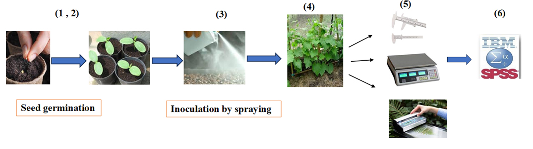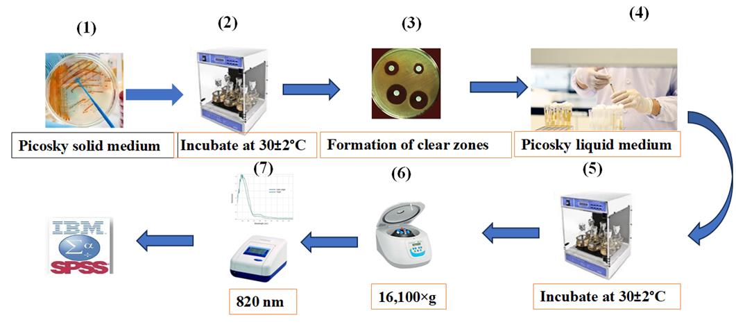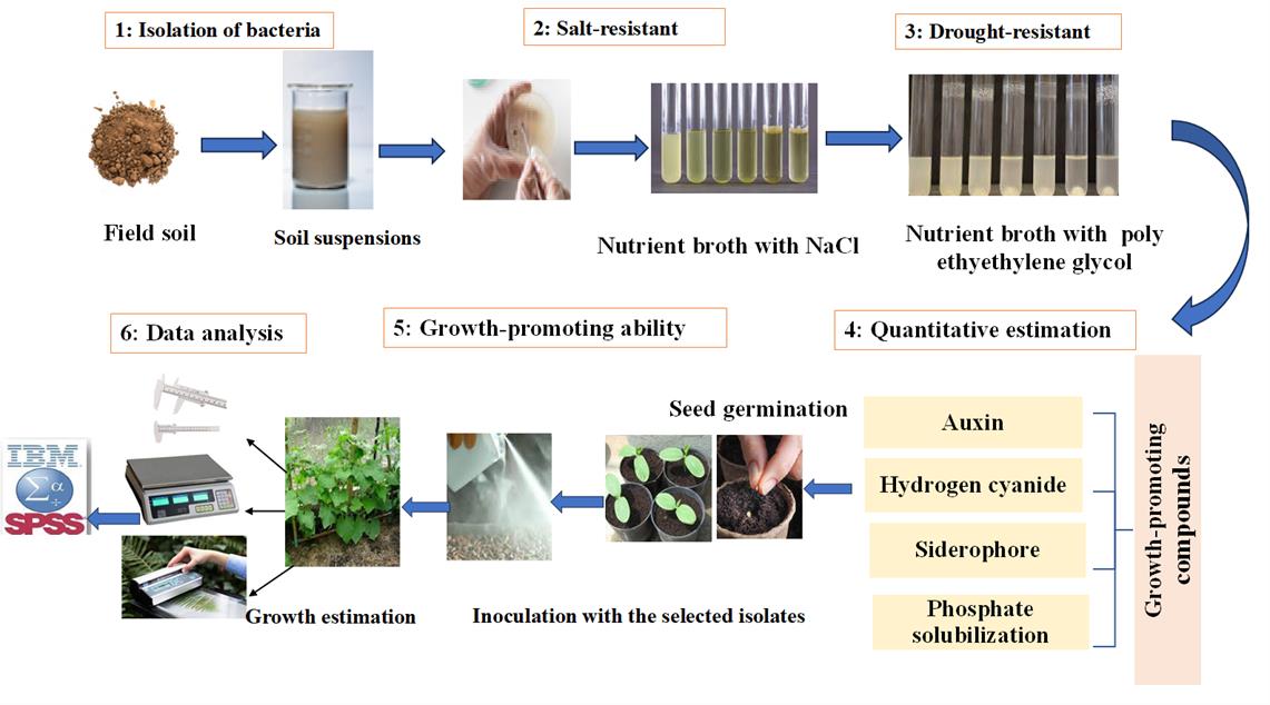 Graphical representation of the protocol for quantitative estimation of growth-promoting compounds in halotolerant bacterial isolates for cucumber growth. 1) Isolation of bacteria. 2) Screening for salt-resistant bacteria. 3) Screening for drought-resistant bacteria. 4) Quantitative estimation of auxin, siderophore, and hydrogen cyanide production, as well as phosphate solubilization activity. 5) Assessing the effect of superior isolates on cucumber seedling growth. 6) Data analysis. Arrows indicate the sequence of the experimental procedure.