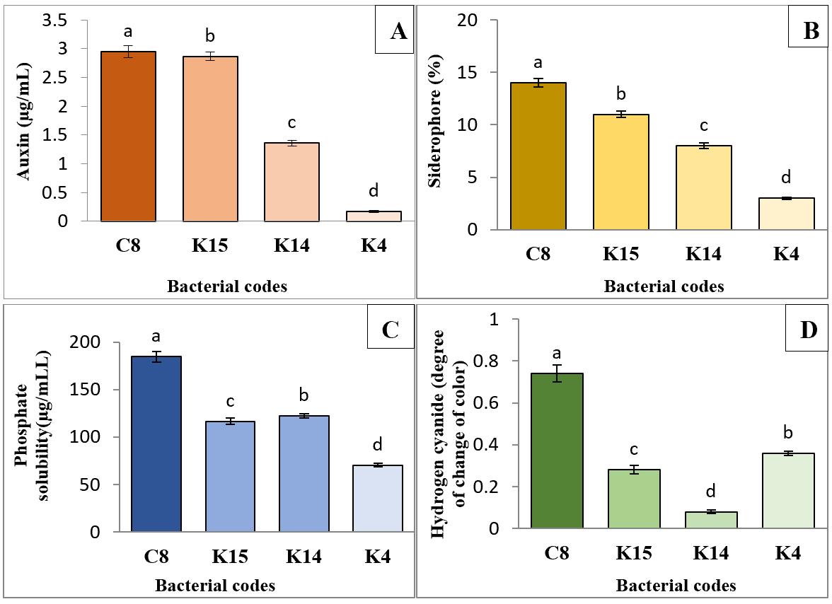 Salt-tolerant bacteria can enhance plant growth through various mechanisms, including the production of auxin, siderophores, hydrogen cyanide, and the solubilization of insoluble phosphate. This study investigated the production of these growth-stimulating factors by salt- and drought-tolerant bacteria isolated from the arid and saline farmlands of Jiroft. Initially, we screened for bacterial strains that exhibited the highest levels of these factors. We then evaluated their effects on improving the growth indices of cucumber seedlings. Additionally, we optimized the protocols for isolating auxin, siderophores, hydrogen cyanide, and phosphate solubilization, which can also be applied to other host rhizobacteria to assess their growth-promoting compounds.