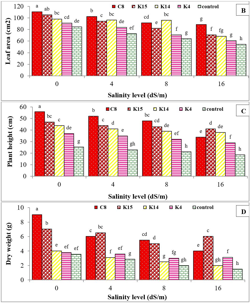 Exposure to salinity stress at 16 dS/m significantly reduced plant height, fresh and dry weights, and leaf area by 29%, 20%, 42%, and 42%, respectively, compared to the control (Figure 7A, B, C, D). Statistical analysis showed that the selected superior isolates significantly improved all growth parameters of cucumber plants subjected to salinity stress for six weeks, with increases of 41.47% in plant height, 34.97% in fresh weight, 7.49% in dry weight, and 85.07% in leaf area (Figure 7A, B, C, D).