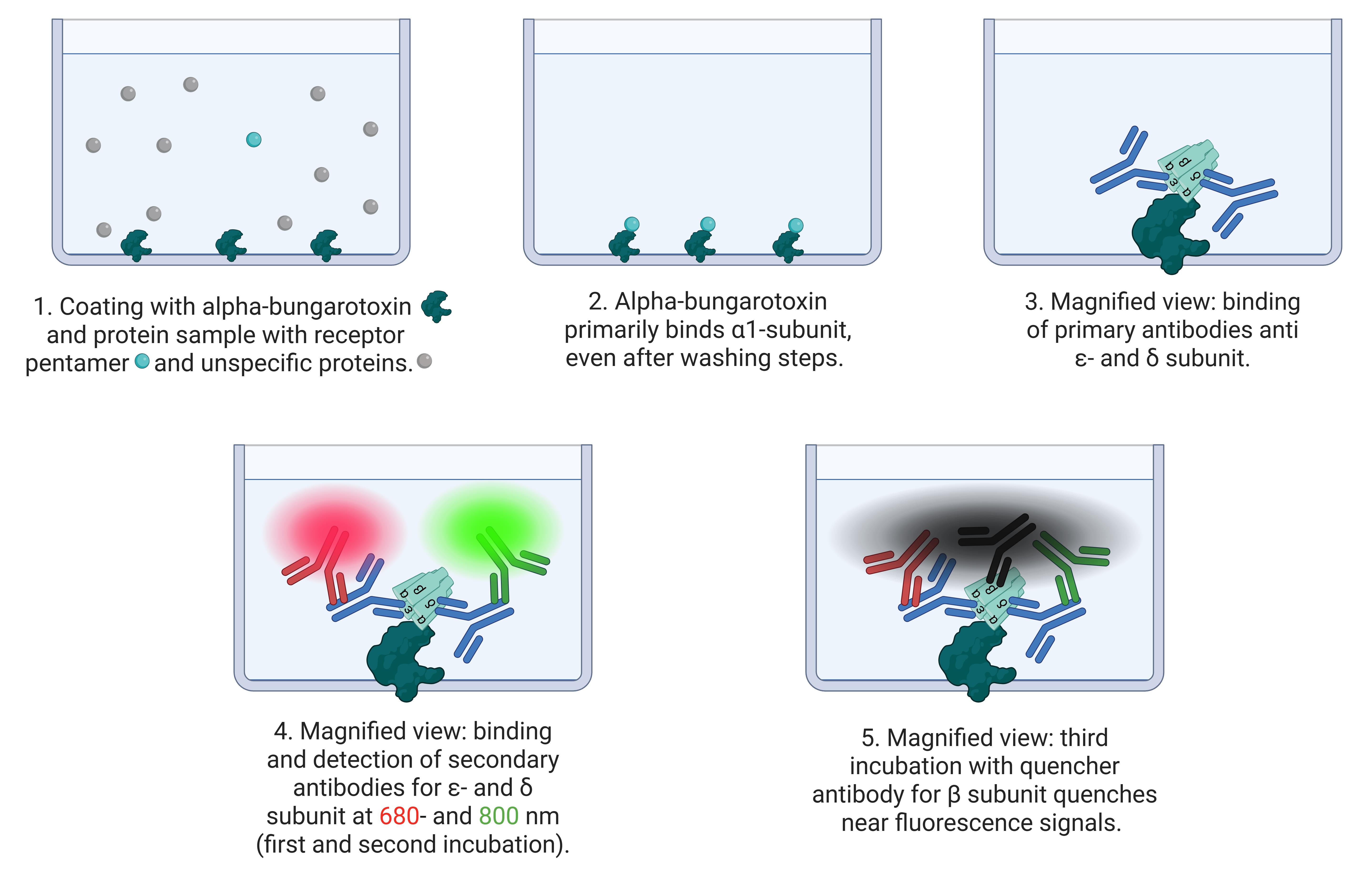 The cluster FLISA technique is similar to the known ELISA (enzyme-linked immunosorbent assay) method. The user employs a coated bait protein that binds the target protein [3] and an antibody to determine the concentration [4]. The cluster FLISA method represents an advancement over this method. The procedure is shown in Figure 1. It enables further antibody binding, specifically for each individual subunit of the target protein. By binding to one specific subunit, the bait protein enables the identification of all other subunits in the target complex via their associations. In the case of nAChR cluster determination, it is alpha-bungarotoxin that binds specifically to the α subunit [5–7]. If an additional subunit is detected, both are subjected to clustering or binding. This performance is executed in sequential steps that ensure the individual detection of each target subunit. The use of an antibody labeled with QC-1 quencher allows subsequent investigation of subunit clustering by extinguishing the detected fluorescence signals [8]. Moreover, it enables the use of a detection device with a limited number of fluorescence channels. By normalizing the protein concentration and analyzing the bound antibody concentrations, data can be compared across various cell lines and diverse proteins. The bait protein we used for the positive control of the assay and concentration determination of the bound antibodies was alpha-bungarotoxin conjugated to biotin. Other bait proteins could be made available by determining other target proteins. In addition, cluster FLISA enables the detection of subunit clustering of a protein without the need for ultracentrifugation, which represents a costly investment in the acquisition phase. Analytical ultracentrifugation is a method for determining the size, density, and shape of proteins [9].
