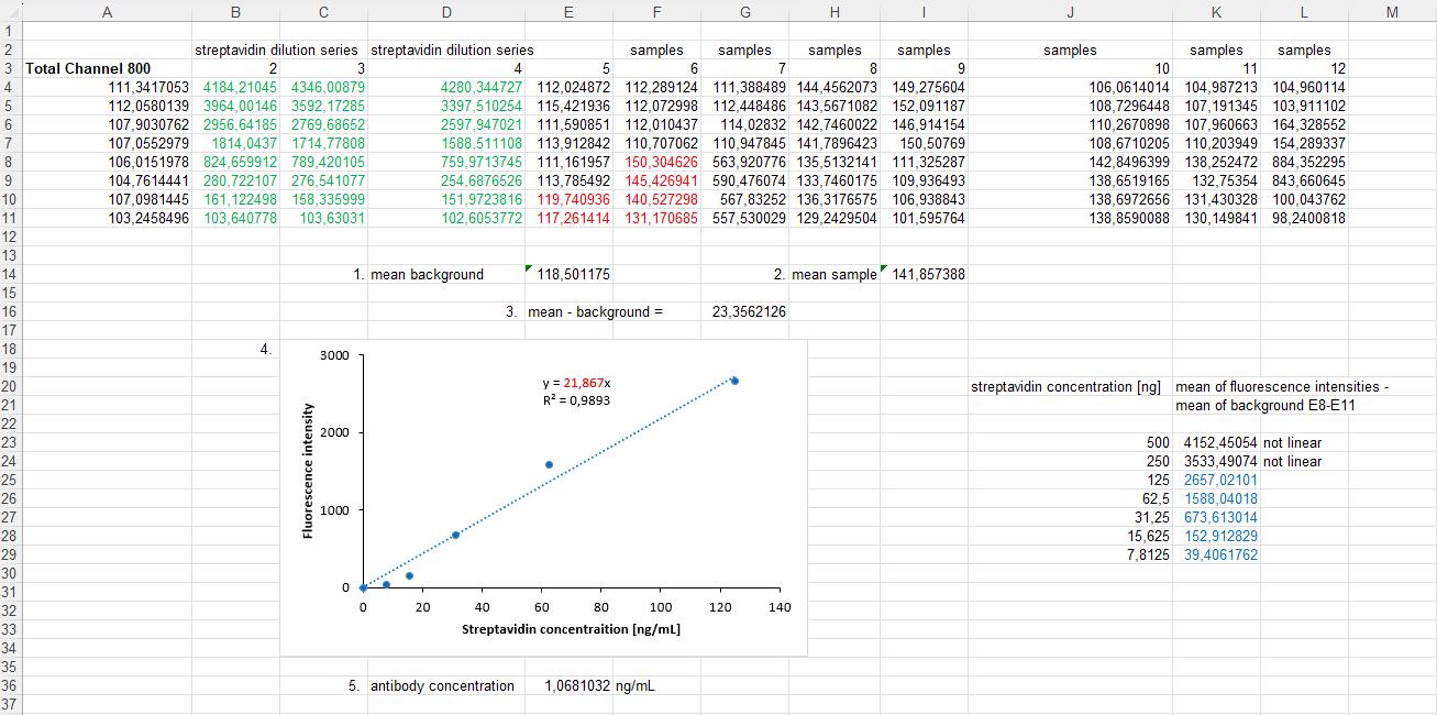 Figure 3. Example calculation of Equations 3 and 4 in an Excel sheet. Rows 6–12 show measured example data of a 96-well microplate. Column E consists of background signals; the examples are highlighted in red. Column F consists of sample signals; the examples are also highlighted in red. Below the raw data: 1. Calculation of the background signals' mean. 2. Calculation of the sample signal's mean. 3. Both results are needed to calculate the normalized fluorescence intensity by subtracting the background fluorescence intensity from the sample fluorescence intensity. (This calculation step is explained in Equation 3 of the protocol.) 4. The fluorescence intensities of the streptavidin dilution are used to generate a linear regression. The values used in the calculation are highlighted in green in columns B–D. The calculation of the mean and subtraction of the background are performed using the same steps as described in 1, 2, and 3. For clarity, the mean streptavidin intensities with the background subtracted are shown on the right side of the graph and are highlighted in blue. Subsequently, the linear regression was used to determine the slope, which is highlighted in red in the graph. 5. Calculate the antibody concentration of the sample by dividing the result from point 3 of this figure by the slope of the linear regression. (This calculation step is explained in Equation 4 of the protocol.)