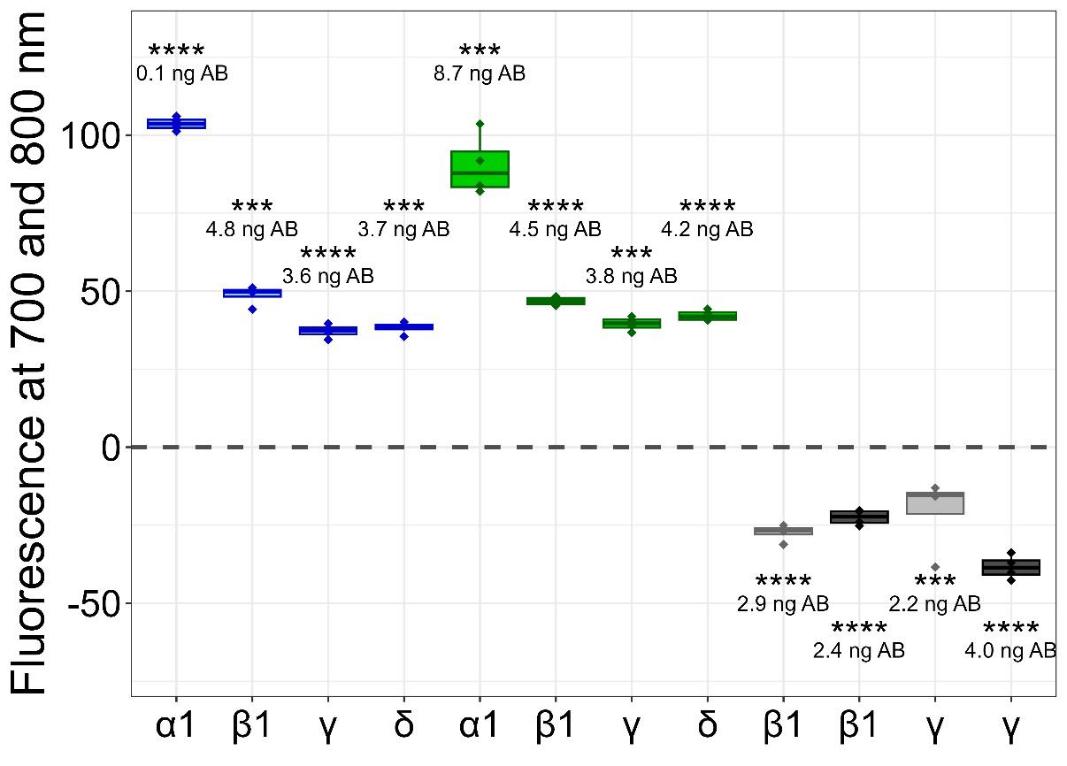 Figure 4. Detected fluorescence signals of clustered subunits for α12β1γδ nicotinic acetylcholine receptor (nAChR). Detections of the first run are indicated by blue boxplots, detections of the second run are indicated by green boxplots, and detections of the third run are indicated by grey boxplots for individual α1/β1/γ/δ subunits. The light-grey boxplots show the quenching of one subunit, whereas the dark-grey boxplots show the quenching of two subunits. The fluorescence levels of subunits were derived from antibody (AB) concentrations, and their significance was compared to the respective backgrounds (first and second runs) or covered (third run) fluorescence signals. P-values below 0.001 were set as significant and marked with ***, and p-values below 0.0001 were also set as significant and marked with ****. The figure was created with RStudio (version 4.4.2).