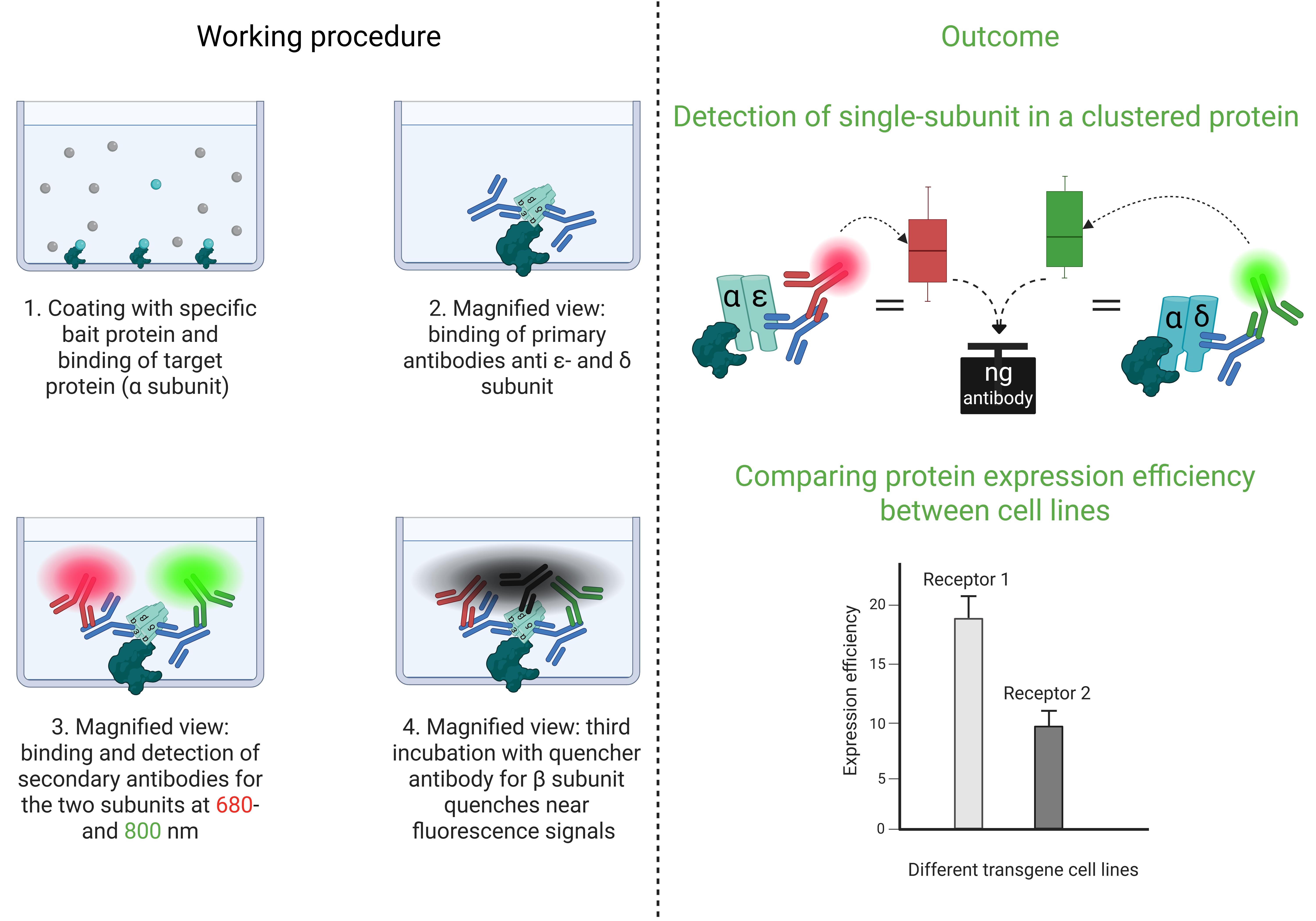 In order to enhance the performance of cluster FLISA, it is necessary for the operator to possess purified transgene proteins. Please note that there are a couple of methods for protein purification, and we do not impose performance requirements for diverse protein columns or magnetic bead-based techniques. However, we recommend determining the protein concentration after the purification procedure to apply similar amounts. The purification of the protein solution used in this protocol was performed as described in our previous publications [1,2]. The subsequent protocol data exemplifies the utilization of cluster FLISA. It describes the exemplary proteins α12β1δε nAChR and α7 nAChR, both of which have a pentameric structure. The α12β1δε nAChR consists of four different subunits in a pentamer, whereas the α7 nAChR is a five-subunit homomeric structured protein. Both transgene cell lines expressing these proteins were generated in our laboratory [1,2]. Operators are required to modify antibodies and bait proteins to their target protein/subunits. Furthermore, we performed our cluster FLISA using the Odyssey CLx (LiCor) for plate scanning, but other devices are also possible for fluorescence scanning. The Odyssey CLx has two detection channels (680 and 800 nm wavelengths), which demonstrate how to use this device or others without scanning channels for every subunit. Any fluorescence scanning device can be used for analysis. Furthermore, the order of subunit detection is not specifically defined and can be freely selected.