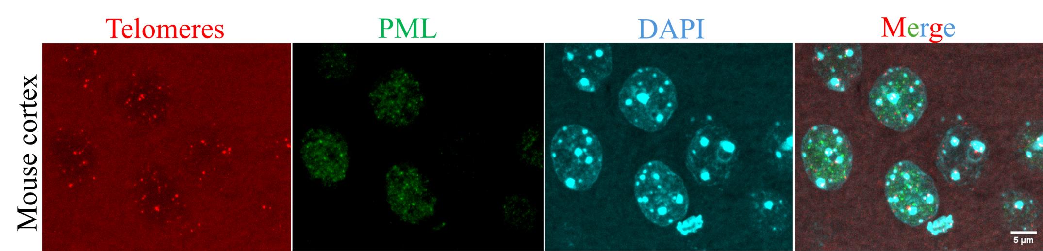 9. Air-dry the slides and mount them in mounting medium. Figure 3 shows an example of the IF-FISH to detect PML and telomere in the cortical neurons of the mouse brain. The images were acquired using a Zeiss LSM 880 confocal microscope equipped with a Plan-Apochromat 63×/1.4 Oil DIC M27 objective.