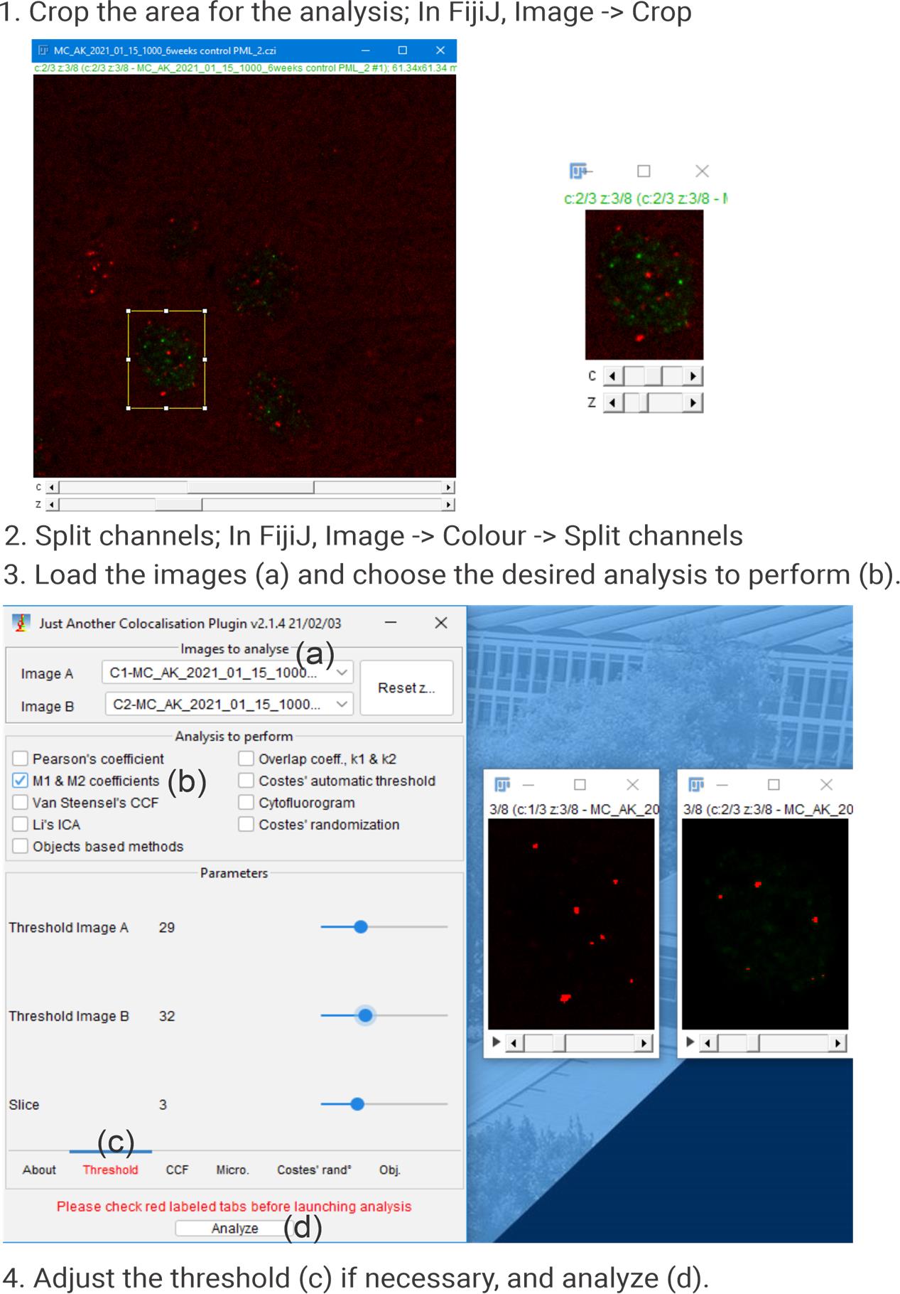 The data analysis was performed as described in the original article [9]. Colocalization between PML bodies or γH2AX foci and telomeres was assessed using Mander’s coefficient via the JaCoP plugin [10] in Fiji (ImageJ) software [11]. Single optical slices from confocal z-stacks were used for the analysis. The individual cells were cropped from merged images containing the two relevant fluorescence channels (PML or γH2AX and telomeres). These were then split into separate channels, and after adjusting thresholds, Mander’s coefficient was calculated to quantify colocalization. Figure 4 illustrates an example of the workflow.