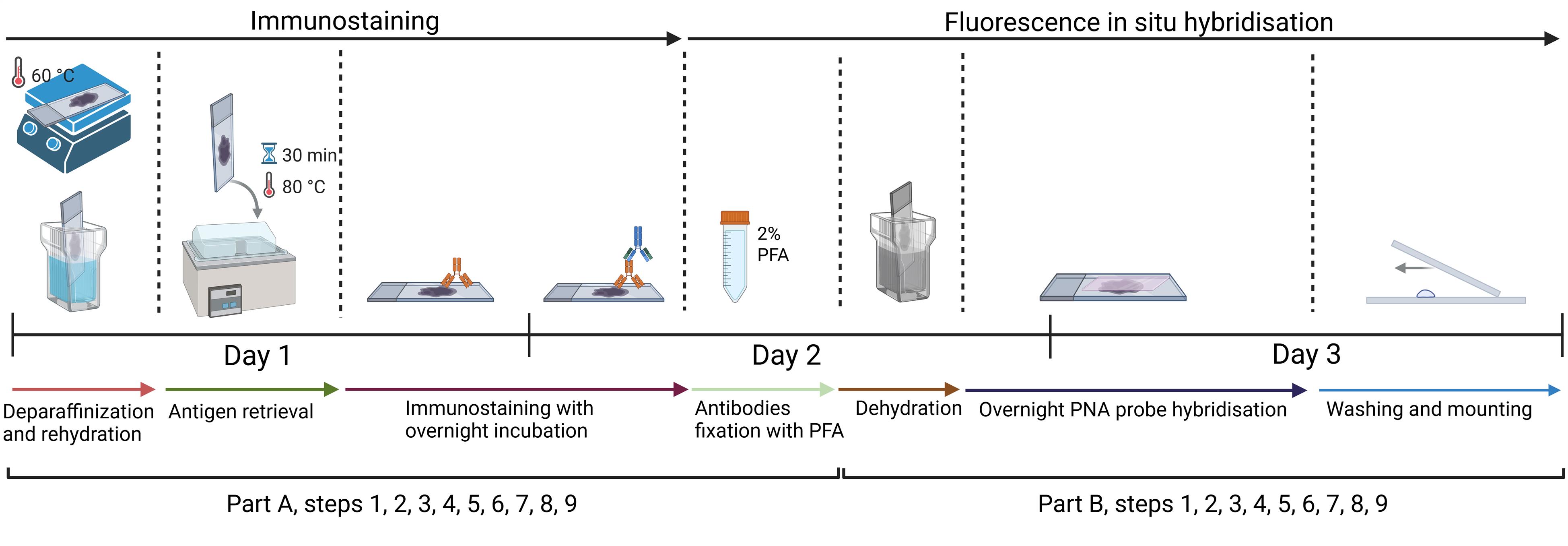 To strengthen the rigor of the study, the inclusion of the following negative controls is proposed: (1) omission of the primary antibody for immunostaining, (2) omission of the PNA probe, and/or (3) use of a scrambled PNA probe with a meaningless sequence.