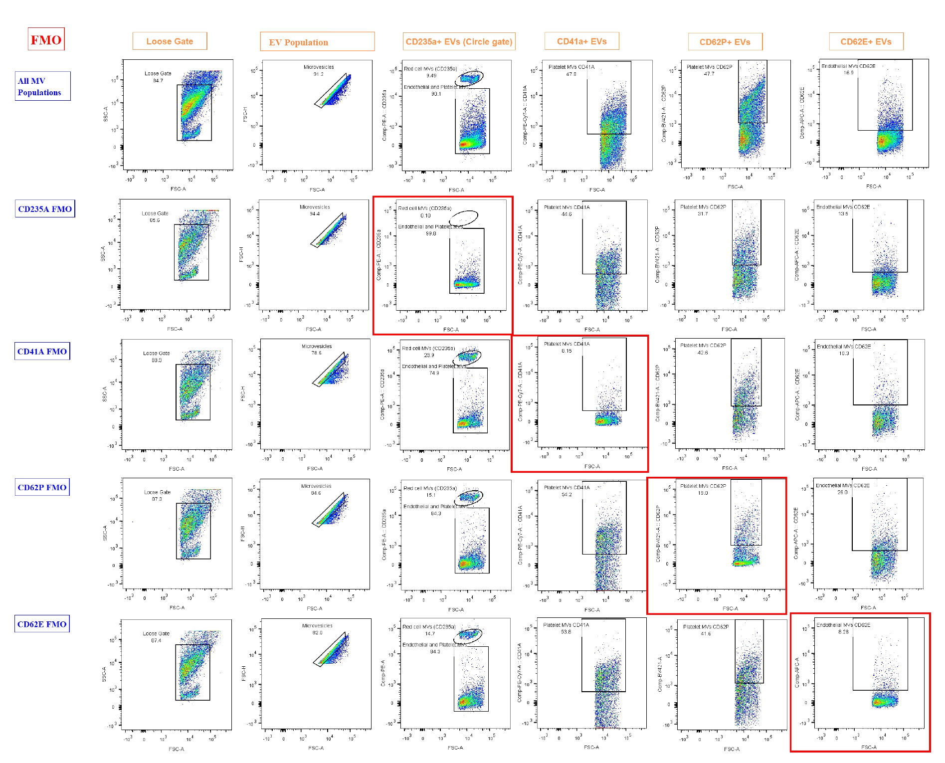 Figure 3. Results of fluorescence-minus-one (FMO). FMO controls were used to define gating boundaries for the identification of extracellular vesicle (EV) subpopulations based on cell-specific markers. Each row represents FMO controls for a specific marker, where one fluorochrome is omitted to determine background fluorescence and set gates accurately. The first row ("All EV Populations") displays the full staining panel, used to demonstrate the overall gating strategy and EV subpopulation distribution. Subsequent rows show FMOs for CD235a, CD41a, CD62P, and CD62E, with the marker of interest omitted in each row. Gating regions were drawn using the negative populations in FMO controls (highlighted by red boxes) to accurately identify positive events in fully stained samples. EVs have a highly diverse composition, with some containing abundant proteins or internal structures. This heterogeneity results in greater variability and often higher levels of intrinsic fluorescence, which was particularly evident in the CD62P FMO. Loose gating was observed in FCS-A vs. SSC-A and in microvesicles on FSC-A vs. FSC-H. Gating for CD235a, CD41a, CD62P, and CD62E was performed on the compensated axis vs. FSC-A.