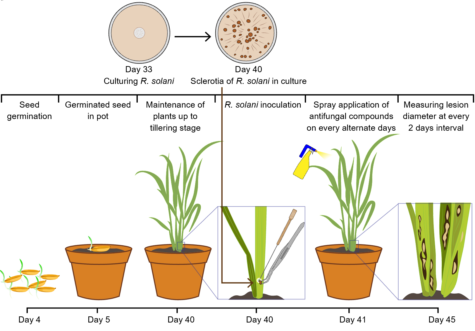 1. Use freshly prepared inoculum and treatments for optimal reproducibility. Sclerotia of R. solani should be harvested from actively growing PDA cultures no more than 24 h before inoculation to maintain viability and pathogenicity.