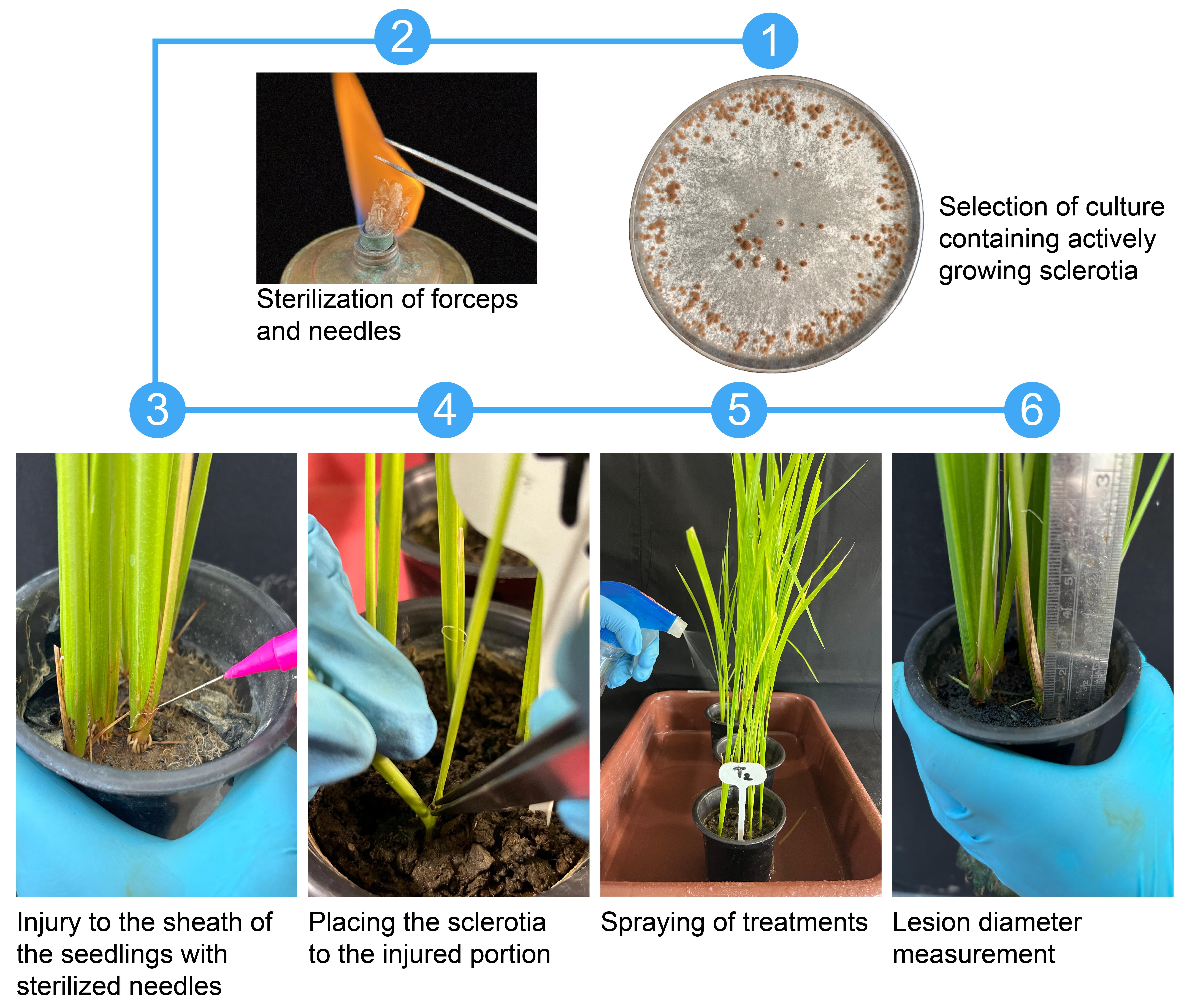 • Establishes a reliable in planta inoculation method for R. solani in rice, overcoming the common challenge of achieving consistent disease development.