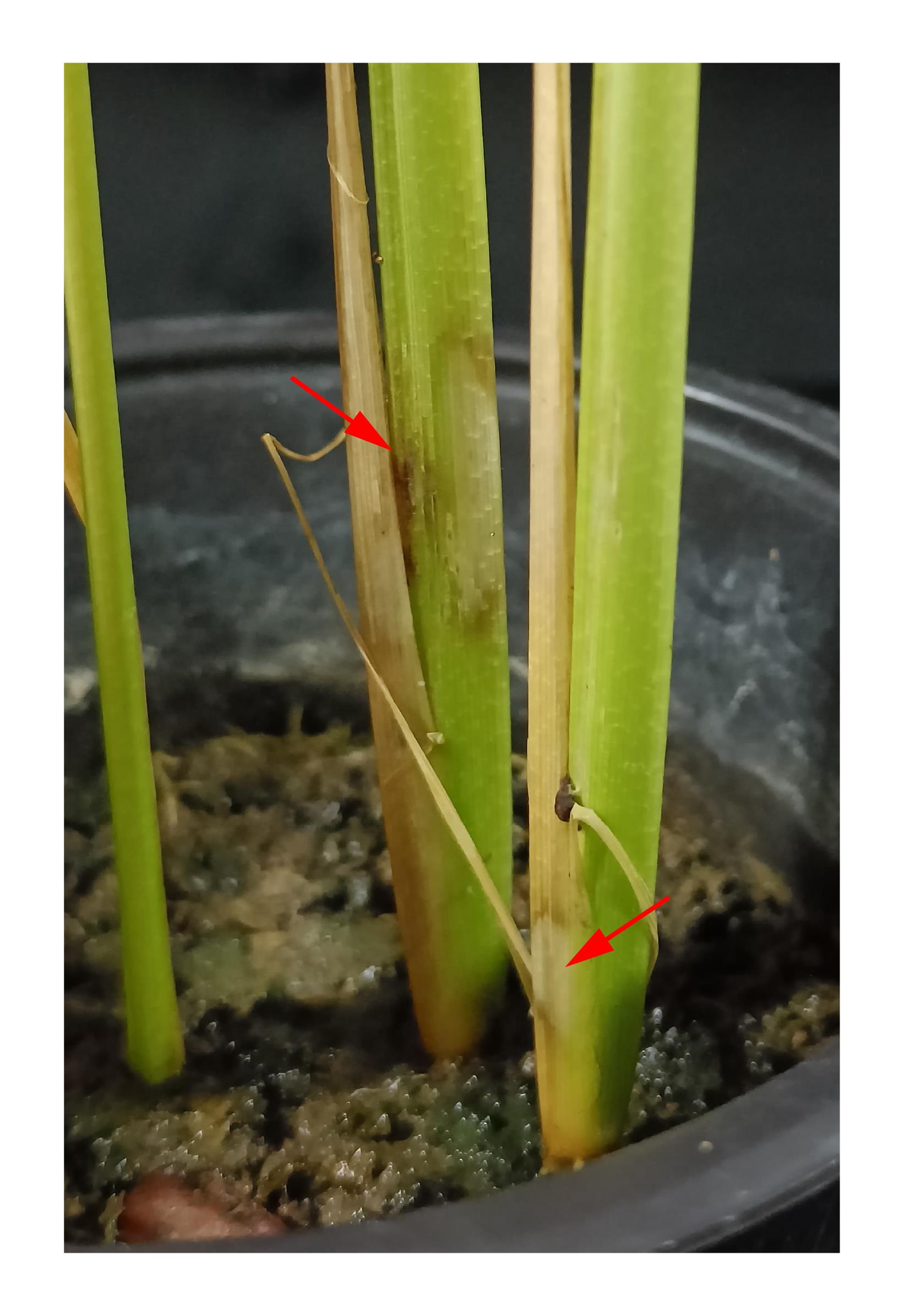 2. Observe plants daily for the development of sheath blight symptoms starting from 4 days post-inoculation (dpi). Water-soaked lesions typically begin to appear at the inoculation site by day 45 (Figure 3).