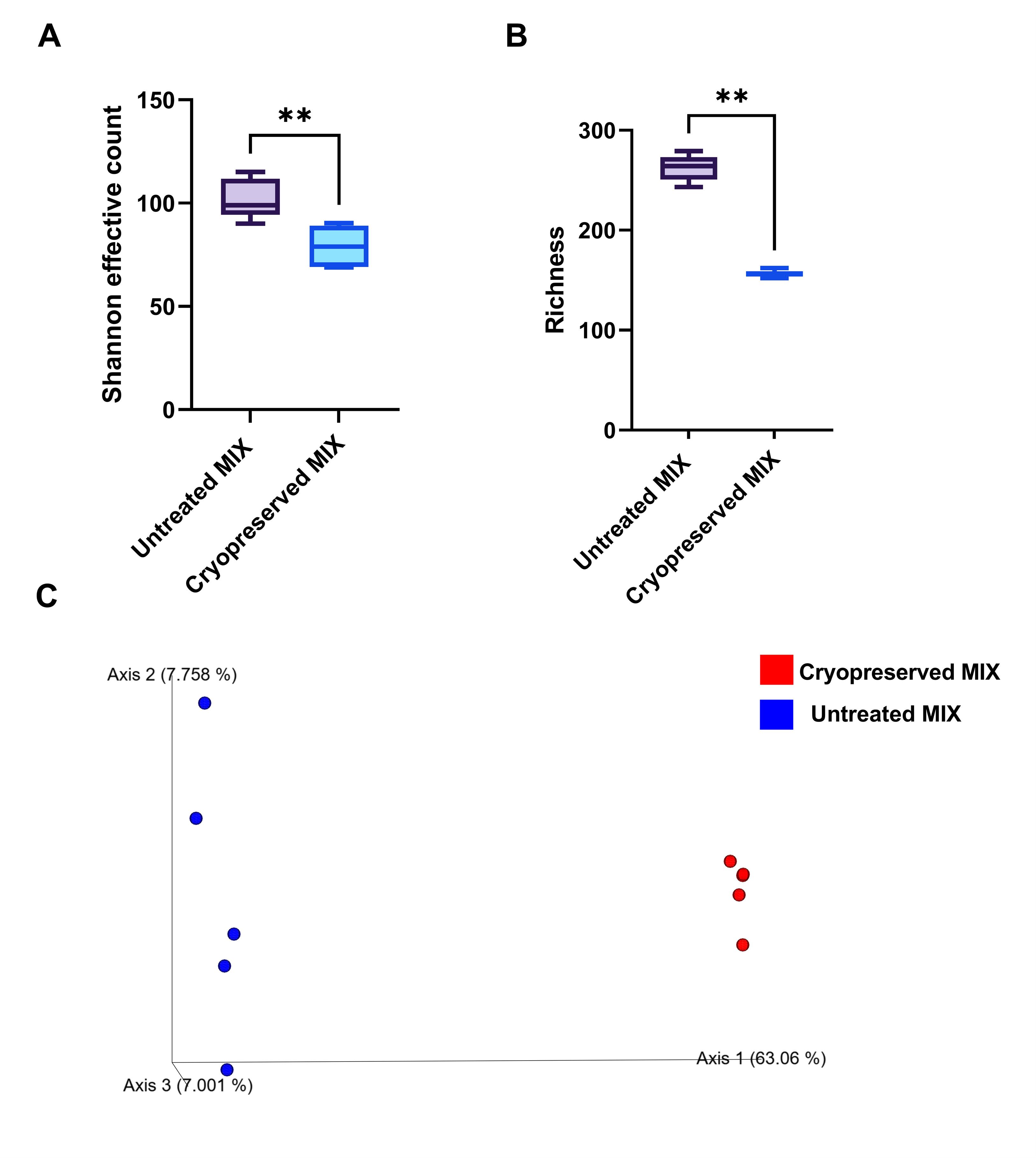 2. This protocol was validated in a previous study by assessing the viability and taxonomic diversity of cryopreserved human GM after thawing [13]. Propidium monoazide (PMA) treatment prior to 16S rRNA gene sequencing was used to selectively analyze viable bacterial cells. Despite a moderate decrease in alpha diversity metrics (Shannon effective count and richness), the post-thaw GM community retained substantial complexity and representativeness (Figure 3). Specifically, approximately 60% of unique bacterial taxa and ~75% of overall community complexity were preserved in the viable fraction after cryopreservation. It is worth noting that part of the apparent diversity loss may be due to the natural presence of non-viable or dead bacterial cells in the stool at the time of collection. Some microbial taxa are known to die before reaching the end of the gastrointestinal tract and are excreted in a non-culturable state [12]. These results are consistent with findings by Bellali et al. [15] who reported ~62% viability of gut microbiota following optimized cryopreservation, as determined by flow cytometry.