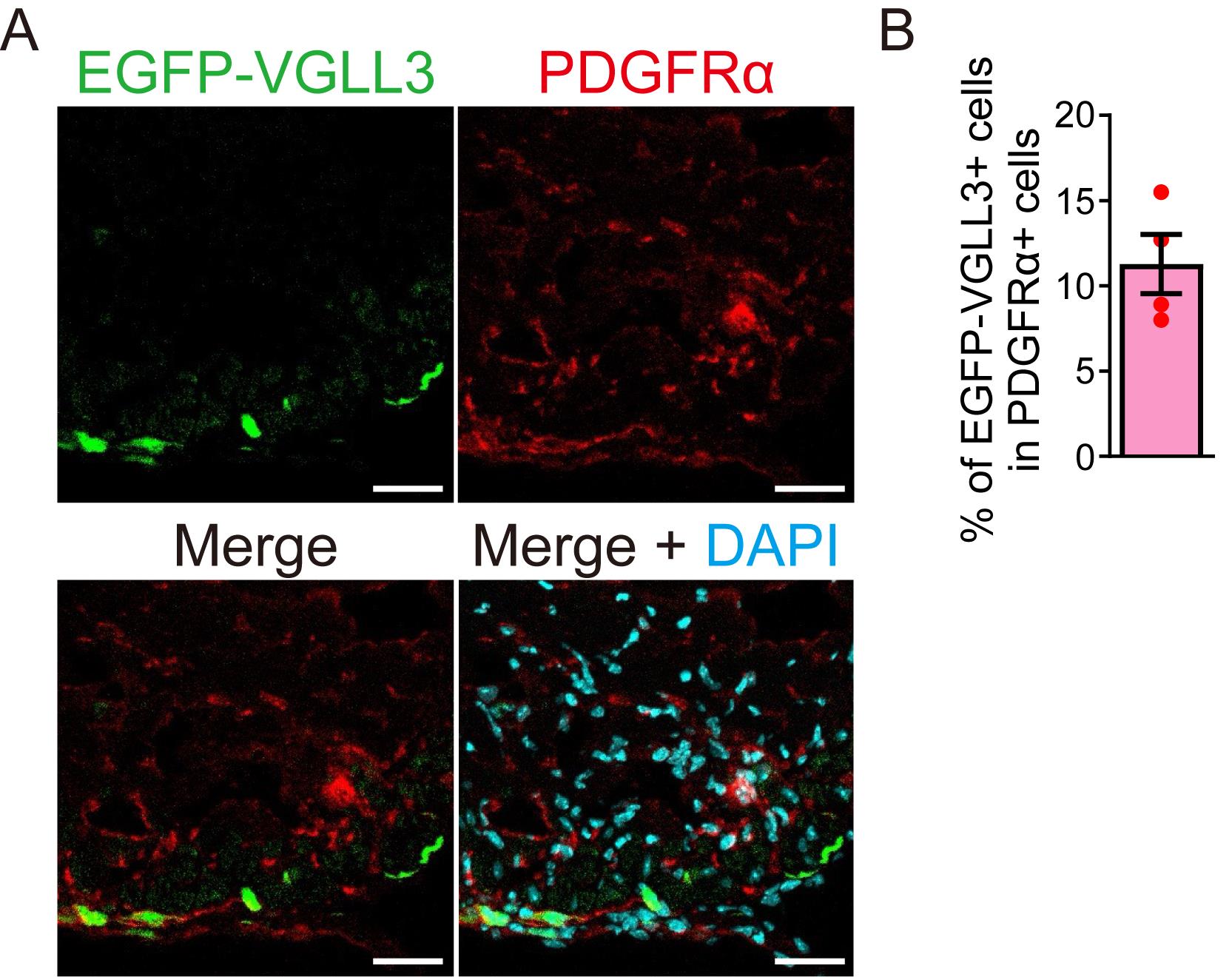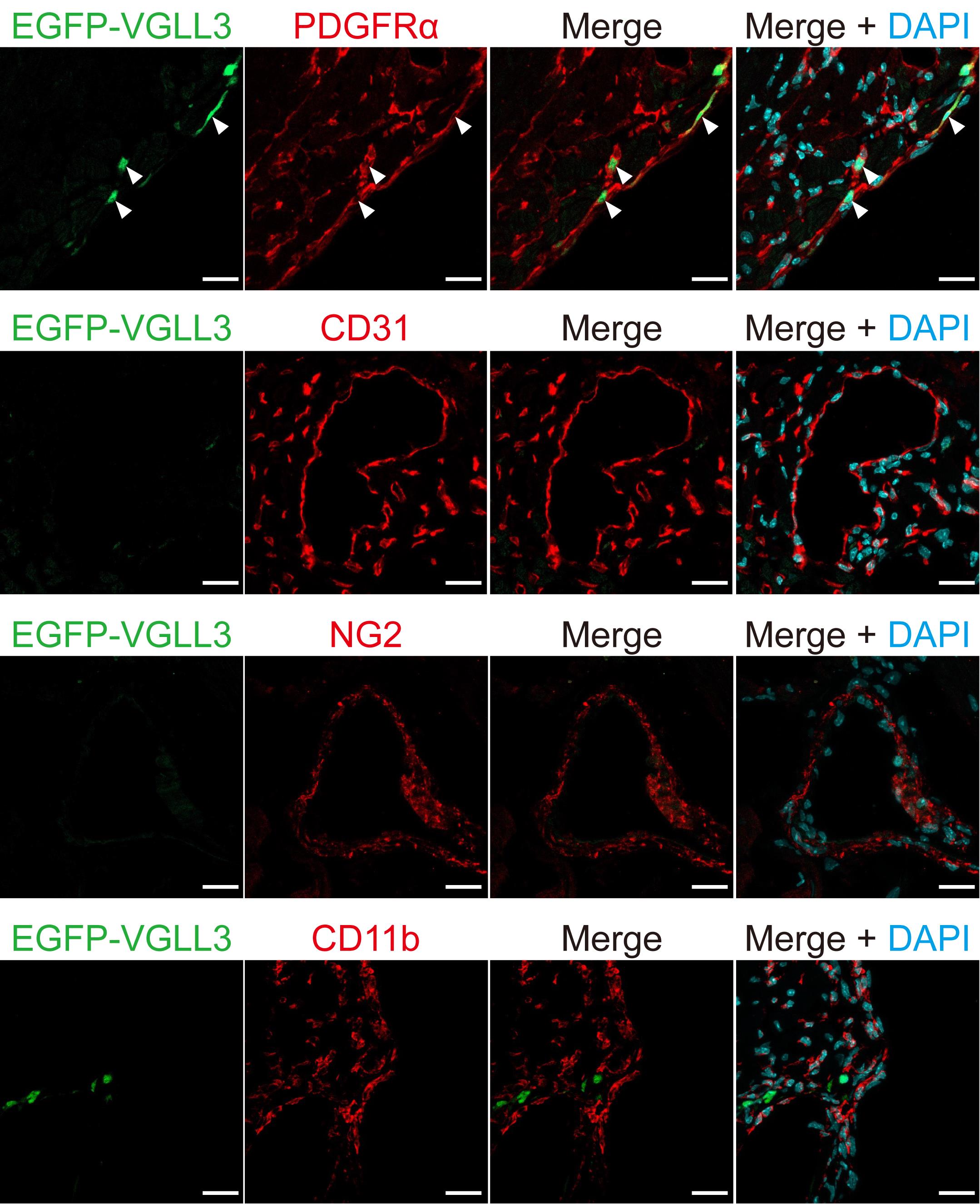 Our immunohistochemical analysis revealed that EGFP-VGLL3 is retrovirally expressed specifically in cells that are positive for PDGFRα and is not expressed in endothelial cells (CD31-positive cells), leukocytes (CD11b cells), and pericytes (NG2-positive cells) (Figure 4).