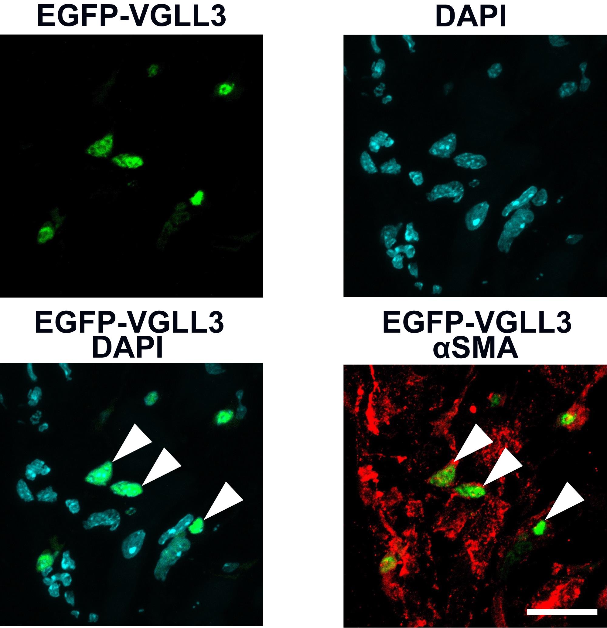 Figure 3. Nuclear localization of EGFP-VGLL3 in myofibroblasts in the left ventricle of myocardial infarction (MI) murine hearts on day 3. This figure is reused from Horii et al. [5]. The intracellular localization of EGFP-VGLL3 in cardiac myofibroblasts was assessed using immunohistochemistry. Myofibroblasts were labeled by staining with αSMA, a major marker. The white arrowheads in the merged image indicate representative signals of VGLL3 in the nucleus of cardiac myofibroblasts. The mouse heart was fixed in 4% PFA/0.1 M phosphate buffer overnight. Scale bar = 20 μm.